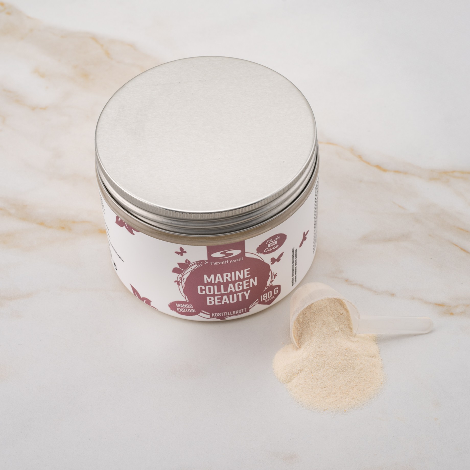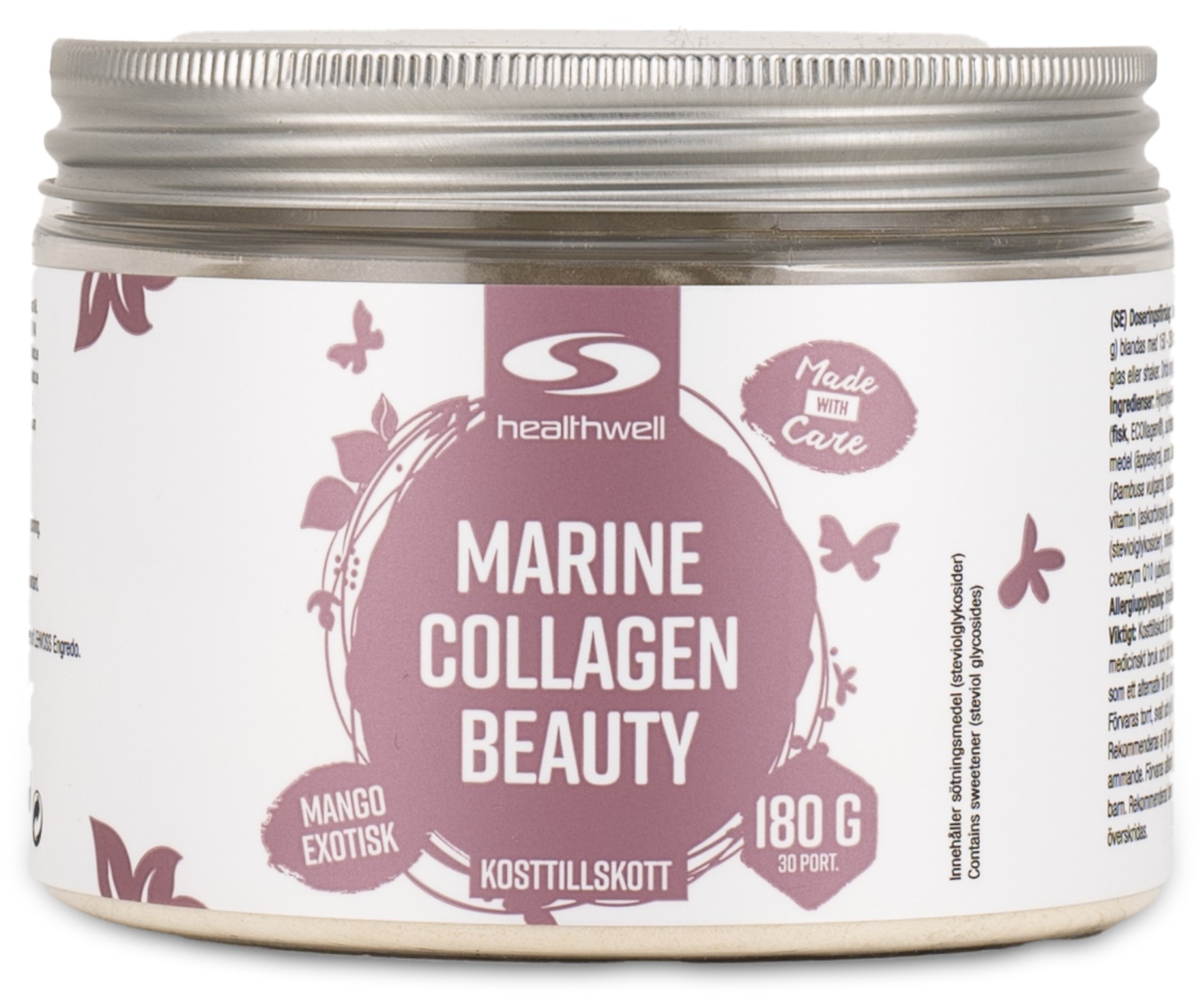 Healthwell Marine Collagen Beauty er et velsmagende tilskud med kollagen fra marine kilder, samt flere gavnlige stoffer, der understøtter hår, hud og negle indefra. Hyaluronsyre binder fugt, mens antioxidanten C-vitamin beskytter huden mod frie radikaler. Tilskuddet er nemt at blande i væske og opløses hurtigt - brug en ske eller en shaker. Den lækre smag af eksotisk mango skjuler enhver antydning af fiskesmag og leder tankerne mod en tropisk strand. Tilskuddet er naturligt sødet med steviolglycosider for en sund oplevelse.