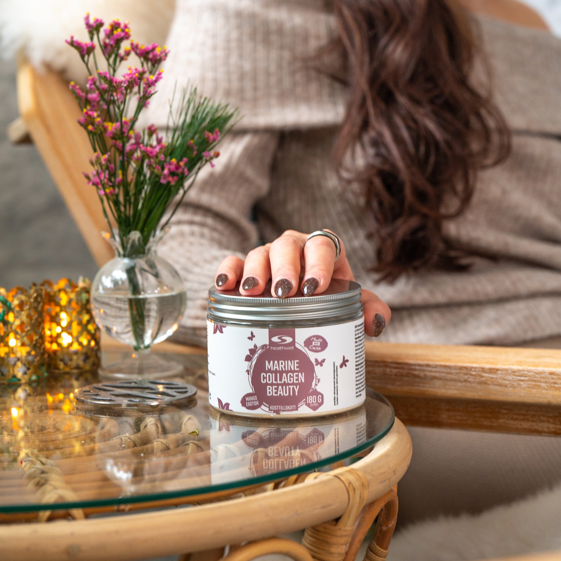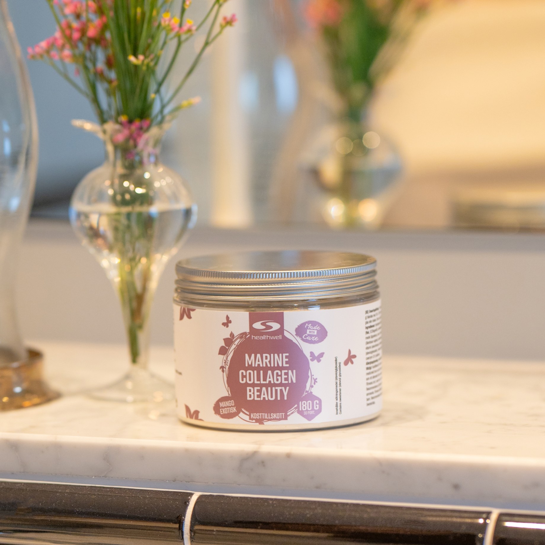 Healthwell Marine Collagen Beauty indeholder marint kollagen for at give hår, hud og negle et rigtigt boost. Marint kollagen har i studier vist sig at være en fordelagtig form for kollagen til huden (1,2). Den marine form for kollagen indeholder nemlig en højere andel kollagen type 1 end bovint kollagen, hvilket er den type kollagen, der ofte anbefales for at støtte opbygningen af hår, hud og negle. Derudover er det marine kollagen i Marine Collagen Beauty hydrolyseret for nemt at kunne optages af kroppen.