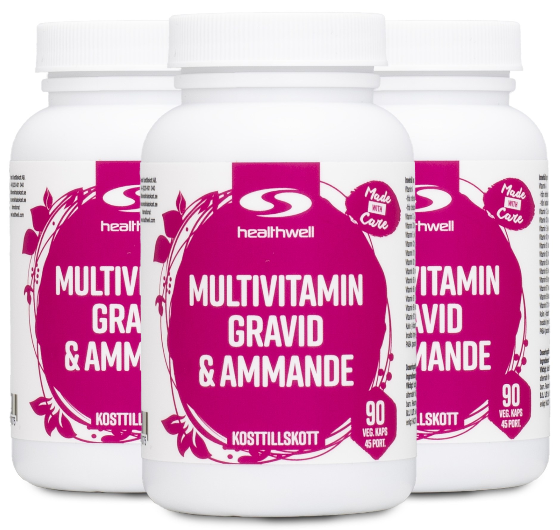 Multivitamin Gravid & Ammende fra Healthwell er et multivitamintilskud specielt udviklet med den gravides behov i fokus. Kosttilskuddet har en kompleks sammensætning af vitaminer, mineraler og urtepræmixer for at opfylde det daglige behov for næringsstoffer til den gravide eller ammende kvinde. Med ekstra jern og folinsyre (vitamin B9) til at støtte bloddannelse og fosterudvikling, samt ekstrakter af broccoli, tomat og blåbær for ekstra næring.