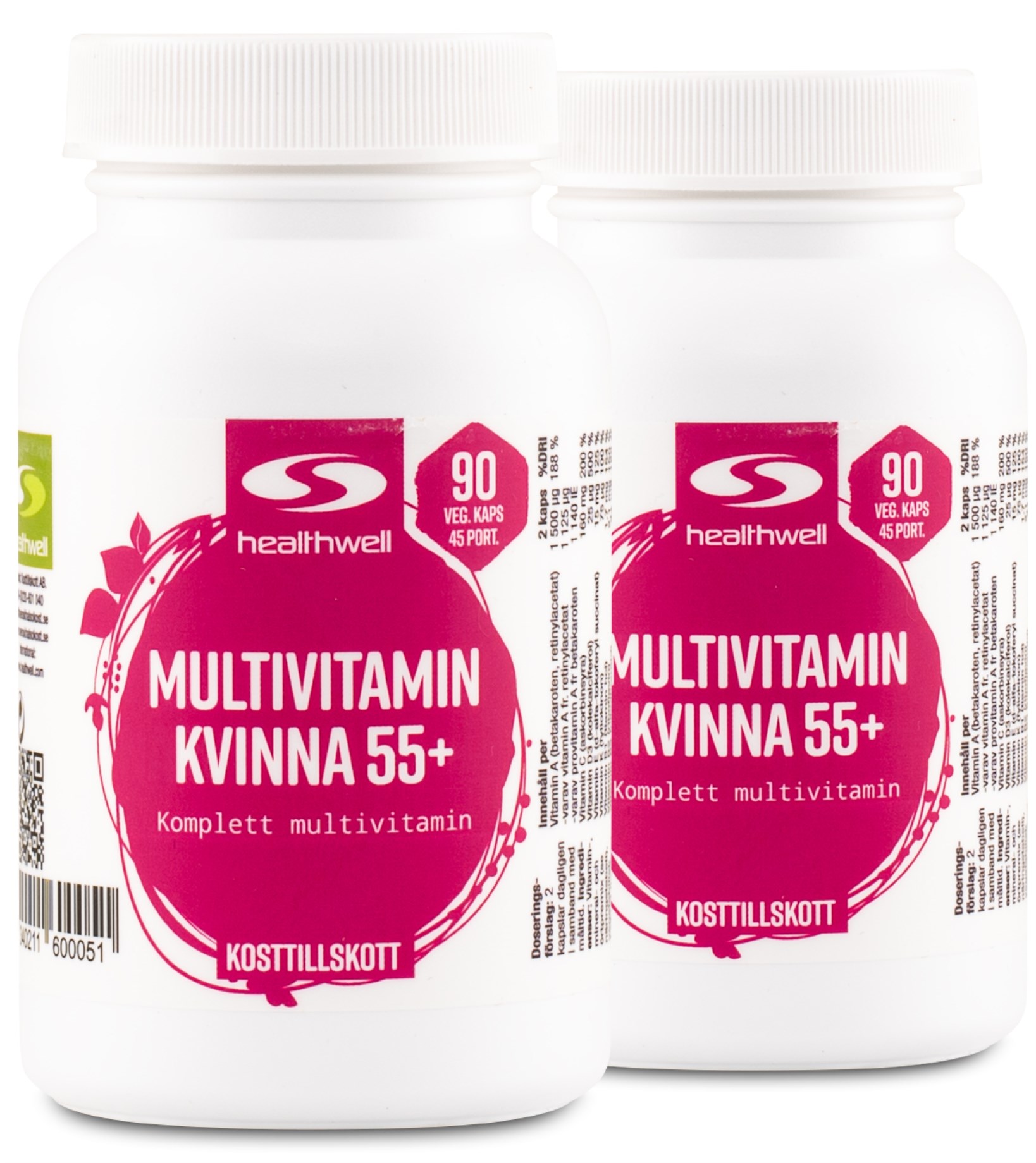 Multivitamin Kvinde 55+ fra Healthwell har taget højde for kvindens skiftende hormonniveauer og ernæringsbehov. Alle vigtige vitaminer og mineraler er inkluderet i passende mængder. Her er A-vitamin med 1500 µg, hvilket er den anbefalede maksimale dosis for kvinder efter 55 år og lavere end for mænd og den unge kvinde. Derudover er produktet helt fri for jern, da kvinder over 55 kun bør tage jerntilskud, hvis de mangler. Der indgår kroppens eget stof coenzym Q10, et stof hvis produktion falder med stigende alder. Q10 fungerer som en kraftig antioxidant og findes i rigelige mængder i hjertet og hjernen.