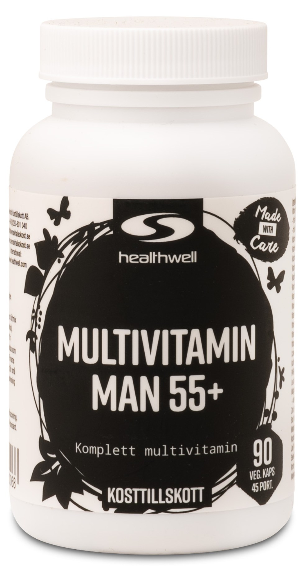 Multivitamin Man 55+ er omhyggeligt designet til mænd over 55 år. I tilskuddet finder du blandt andet coenzymet Q10. Stoffet findes naturligt i vores celler, hovedsageligt omkring kroppens vitale organer som hjerte og blodkar. Q10 har antioxidanteffekt og er vigtig for kroppens energiomsætning. Kroppen kan selv producere Q10, men denne produktion falder, når man bliver ældre. Stigende alder kan også påvirke vores syn. Derfor indeholder Multivitamin Man 55+ også stoffet lutein fra calendula. Lutein er et provitamin, der kan omdannes til vitamin A, et vitamin, der virker for normalt syn og øjets normale funktion. Græskarfrøekstrakt og granatæble tilsættes også for at fremme en sund prostata.