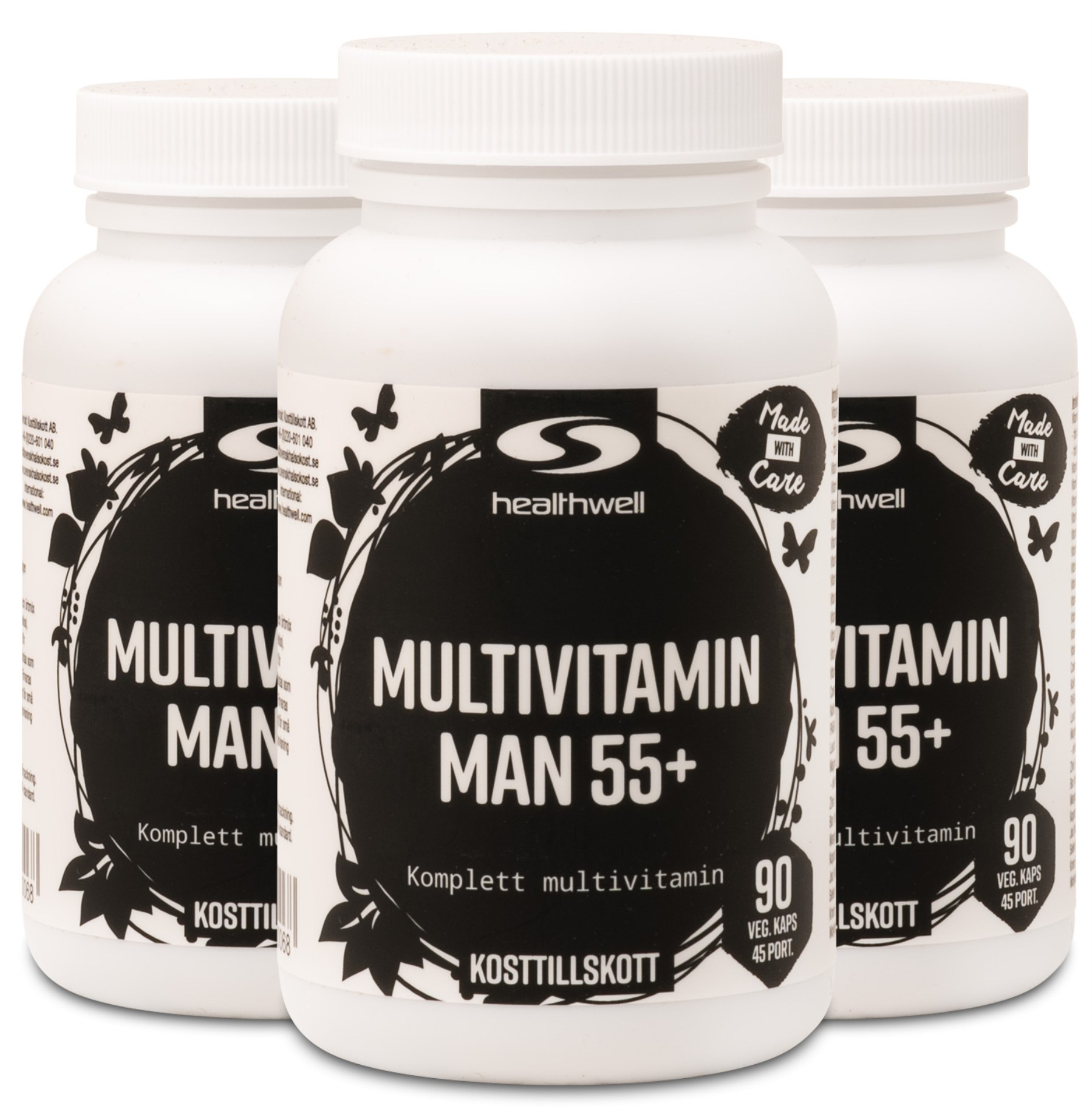Multivitamin Man 55+ er omhyggeligt designet til mænd over 55 år. I tilskuddet finder du blandt andet coenzymet Q10. Stoffet findes naturligt i vores celler, hovedsageligt omkring kroppens vitale organer som hjerte og blodkar. Q10 har antioxidanteffekt og er vigtig for kroppens energiomsætning. Kroppen kan selv producere Q10, men denne produktion falder, når man bliver ældre. Stigende alder kan også påvirke vores syn. Derfor indeholder Multivitamin Man 55+ også stoffet lutein fra calendula. Lutein er et provitamin, der kan omdannes til vitamin A, et vitamin, der virker for normalt syn og øjets normale funktion. Græskarfrøekstrakt og granatæble tilsættes også for at fremme en sund prostata.