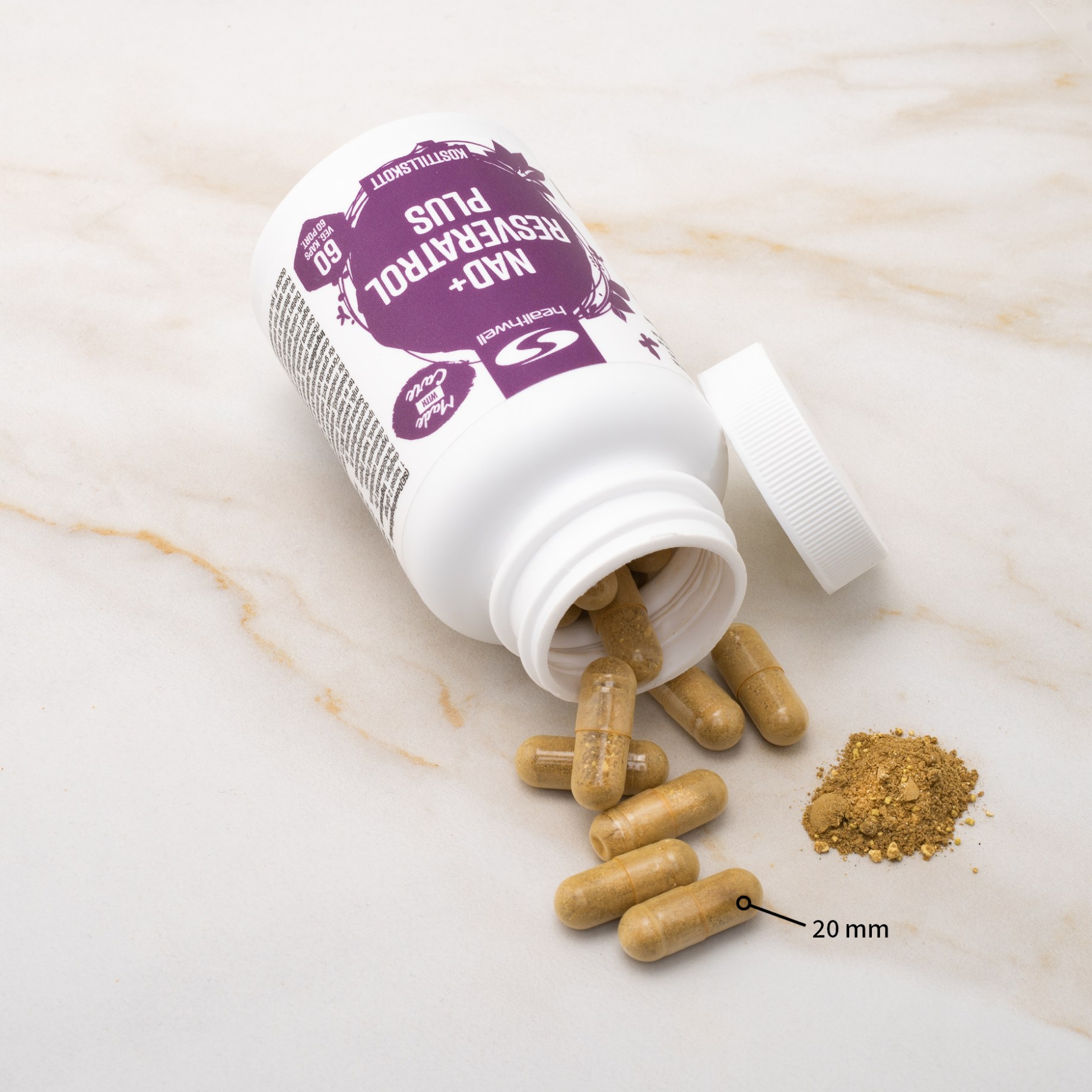 For at maksimere effekten indeholder Healthwell NAD+ Resveratrol Plus også quercetin, Q10, trimethylglycin, bor og piperin. Quercetin bidrager til at øge niveauerne af NAD+ i kroppen (2), mens Q10 sammen med NAD+ hjælper med at reducere træthedssymptomer (3). Trimethylglycin, også kendt som betain, understøtter methyleringsprocessen, som er nødvendig for optagelsen af NAD+, der er en form for vitamin B3. Bor virker ved at binde sig til NAD+ og forlænger dets virkning i kroppen, mens piperin er tilføjet for at fremme absorptionen af resveratrol, der er et fedtopløseligt stof.