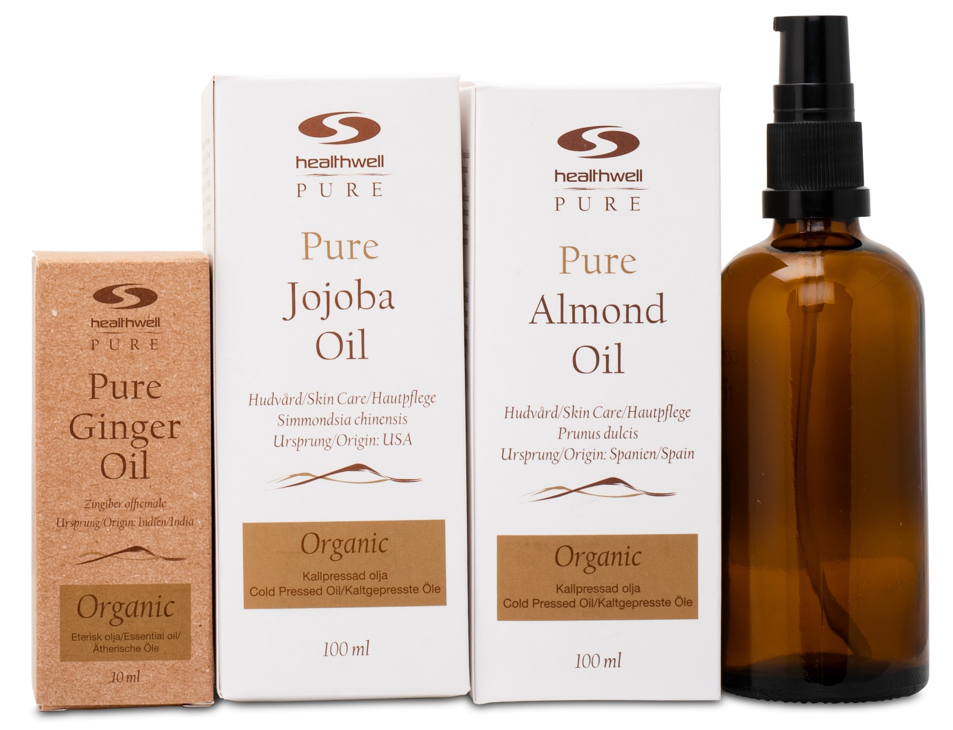 - Mandelolie, jojobaolie og æterisk ingefærolie