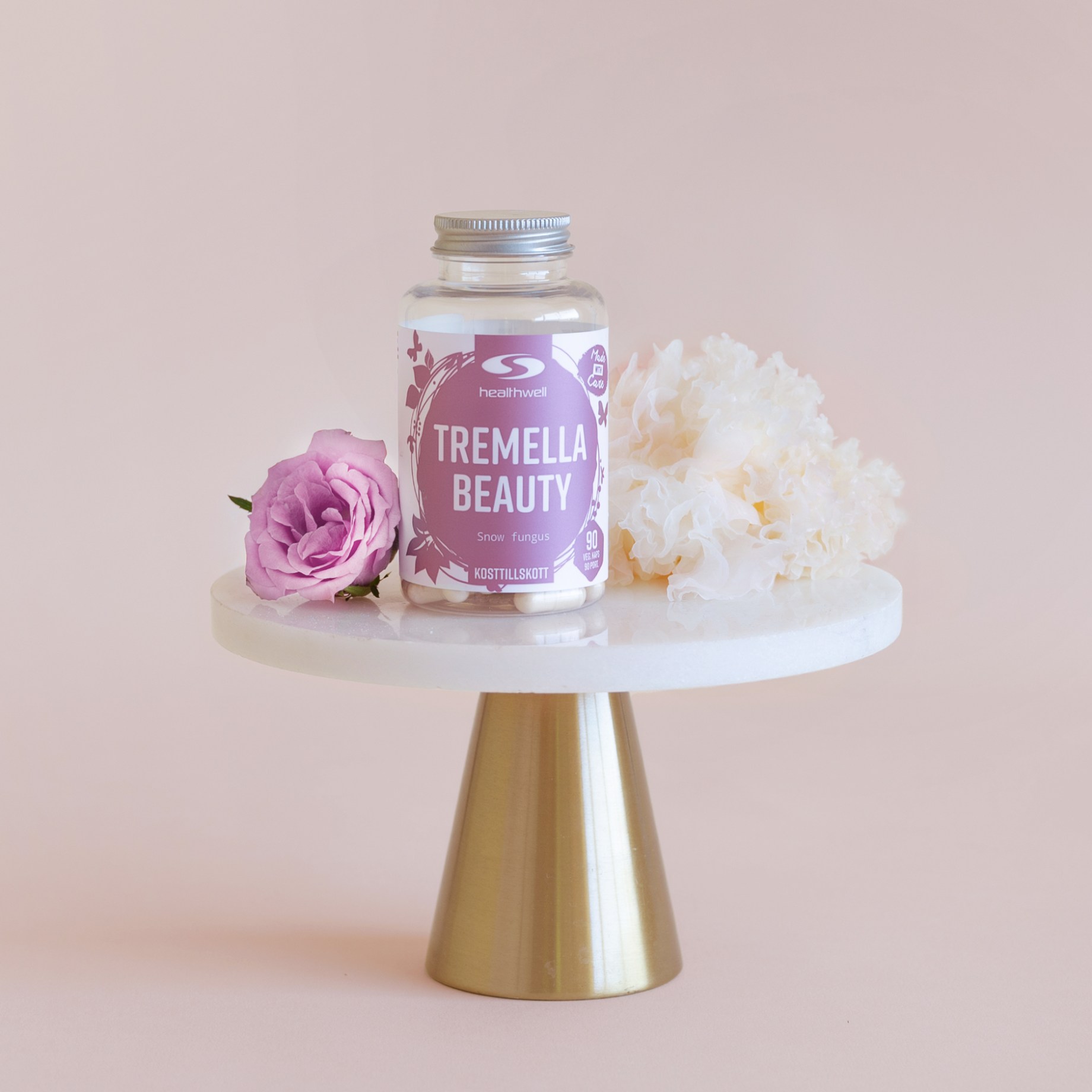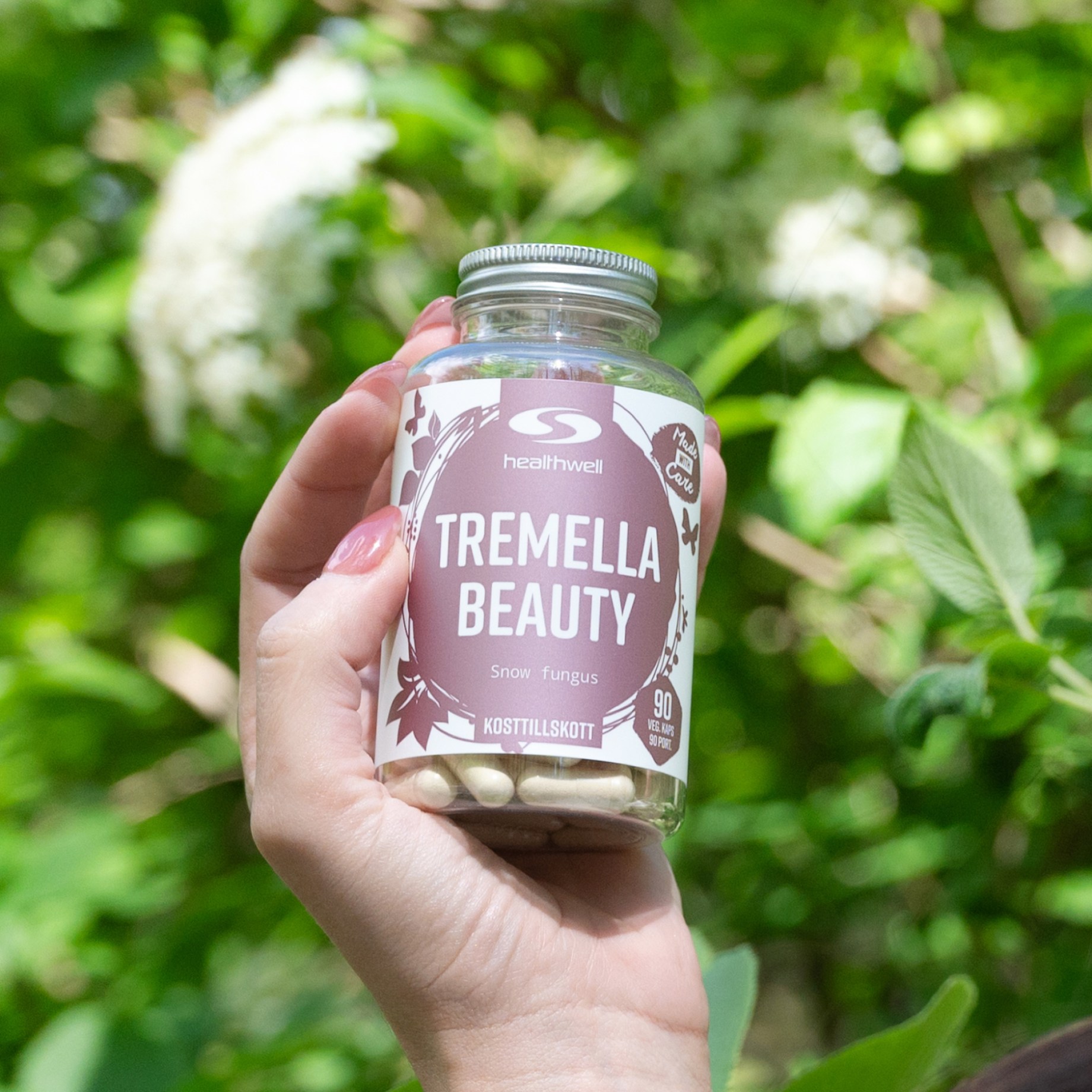 Healthwell Tremella Beauty er til dig, der ikke kan få nok næring til huden! Tremella (Snow Fungus) er en gelésvamp – ofte omtalt som “skønhedssvampen” – og siges at have bemærkelsesværdige egenskaber, både indvendigt og udvendigt. Den sammenlignes med både hyaluronsyre og kollagen, som anses for mestre i at bevare fugt og elasticitet i huden. Tremella bruges derfor ofte i anti-aging kategorien. Healthwell Tremella Beauty indeholder 500 mg svampeekstrakt pr. kapsel med en anbefalet dosis på 1-2 kapsler om dagen.