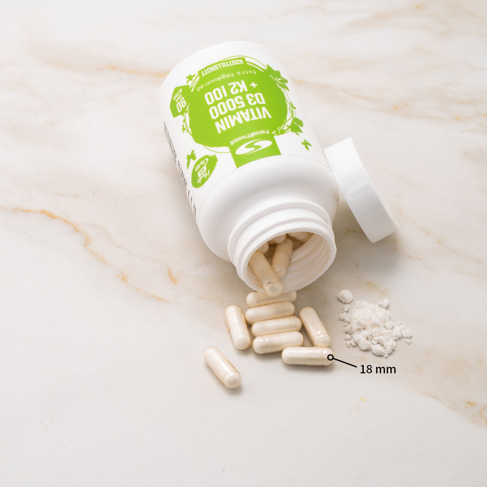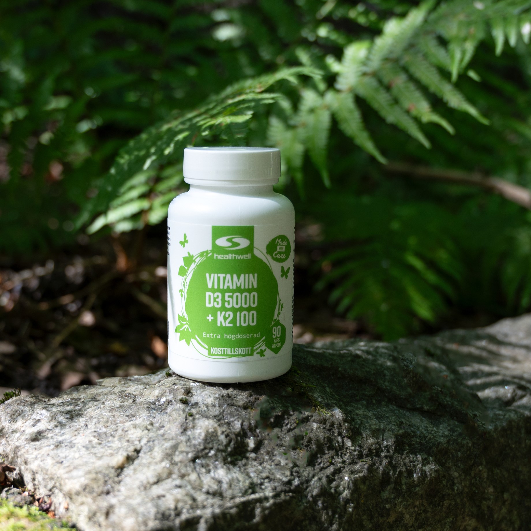 Healthwell Vitamin D3 5000 + K2 100 er vores højest doserede D-vitamin i en fordelagtig kombination med vitamin K! I vinterhalvåret kan det være svært for mange at få nok D-vitamin, og derfor kan et tilskud være med til at sikre indtaget. D-vitamin er vigtigt for kroppen og bidrager både til immunforsvarets normale funktion samt til normal knoglesundhed. Mens D-vitamin hjælper kroppen med at optage calcium, regulerer K-vitamin, hvad calciumet bruges til. Ved høje doser af D-vitamin er det fordelagtigt at indtage K-vitamin for bedre calciumomsætning.