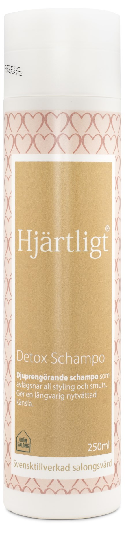 Hjärtligt Detox Shampoo er en dybdevirkende salonshampoo med langvarig effekt. En økologisk shampoo med 100% bionedbrydelige ingredienser med Grøn Salon mærkning. Shampooen indeholder blandt andet pH-neutraliseret mælkesyre samt blåbærekstrakt, fri for parabener, silikoner, PEG/PPG, nanopartikler og hormonforstyrrende stoffer. Produceret i Sverige.