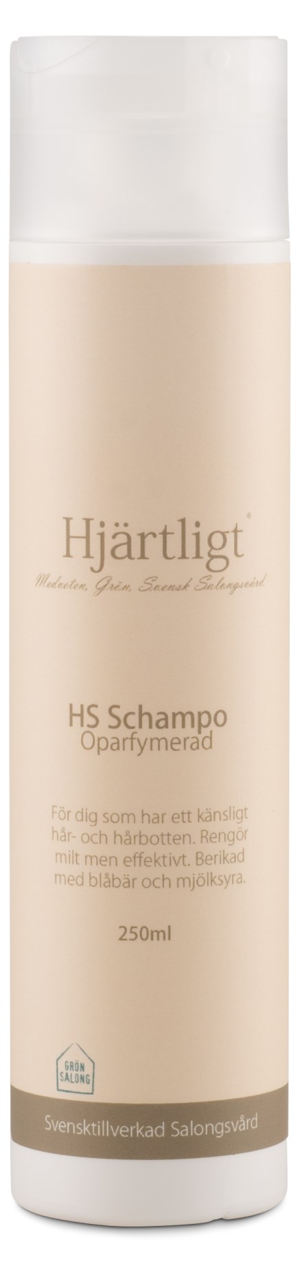 Hjärtligt High Sensitive Shampoo er en salonshampoo specielt udviklet til følsomt hår og følsom hovedbund. Hjärtligt HS Shampoo har en mild blanding baseret på naturlige rensemidler, der giver et fantastisk resultat. Fri for parfume, parabener, nanopartikler og hormonforstyrrende stoffer. 100% bionedbrydeligt og godkendt af Grøn Salon - et miljømærke, der garanterer et miljøvenligt indhold.