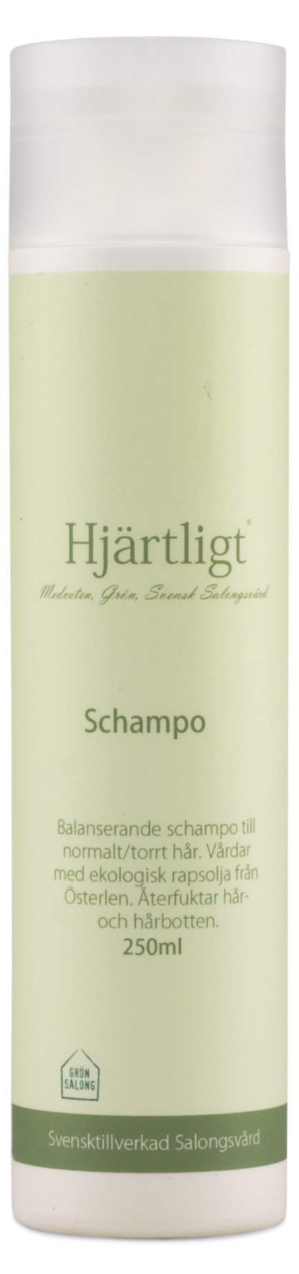 Hjärtligt Shampoo er en miljøvenlig og svenskproduceret shampoo med 100% bionedbrydelige ingredienser. Shampooen er fri for farvestoffer, silikone, mineralolier, nanopartikler og hormonforstyrrende stoffer. I stedet anvendes naturlige og milde vaske ingredienser. Shampooen er desuden mildt parfumeret. Den økologiske rapsolie fra Österlen hjælper med at beskytte håret og opretholde hårets fugt. Håret bliver let at rede ud og får glans og glød. Velegnet til alle hårtyper fra normalt til følsomt hår.