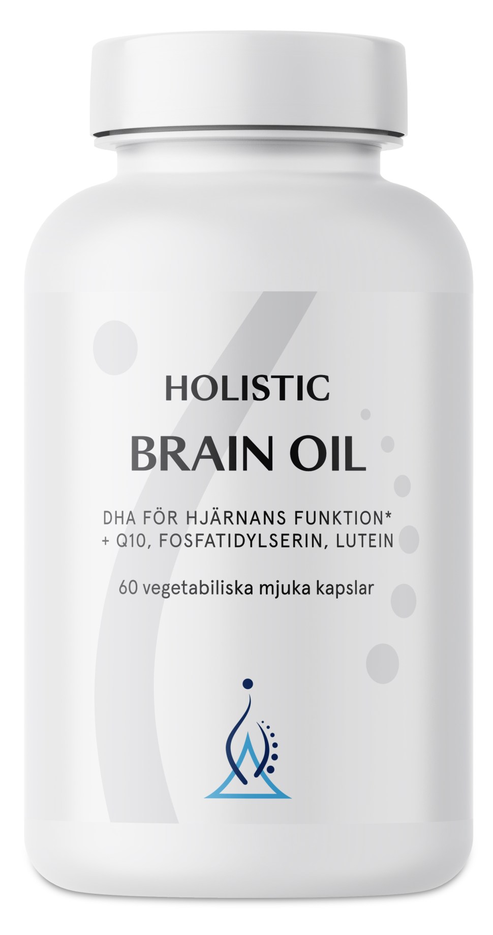 Holistic Brain Oil er et kosttilskud med en kombination af næringsstoffer, der naturligt forekommer i hjernen og øjnene. Formlen kombinerer DHA med coenzym Q10, fosfatidylserin og lutein. I kroppen findes coenzym Q10 i kroppens mitokondrier, som ofte kaldes "cellernes kraftværk", hvor det bidrager til energiproduktionen. Fosfatidylserin er en del af hjernens cellemembran, og kroppens egne niveauer af fosfatidylserin har betydning for nervecellernes kommunikation. Lutein er et næringsstof, der findes naturligt i øjets gule plet og i hjernevæv. Én kapsel Holistic Brain Oil indeholder 250 mg DHA, en mængde der bidrager til at opretholde normal hjernefunktion og normalt syn. Brain Oil er 100 % vegansk og indeholder ingen unødvendige tilsætningsstoffer.