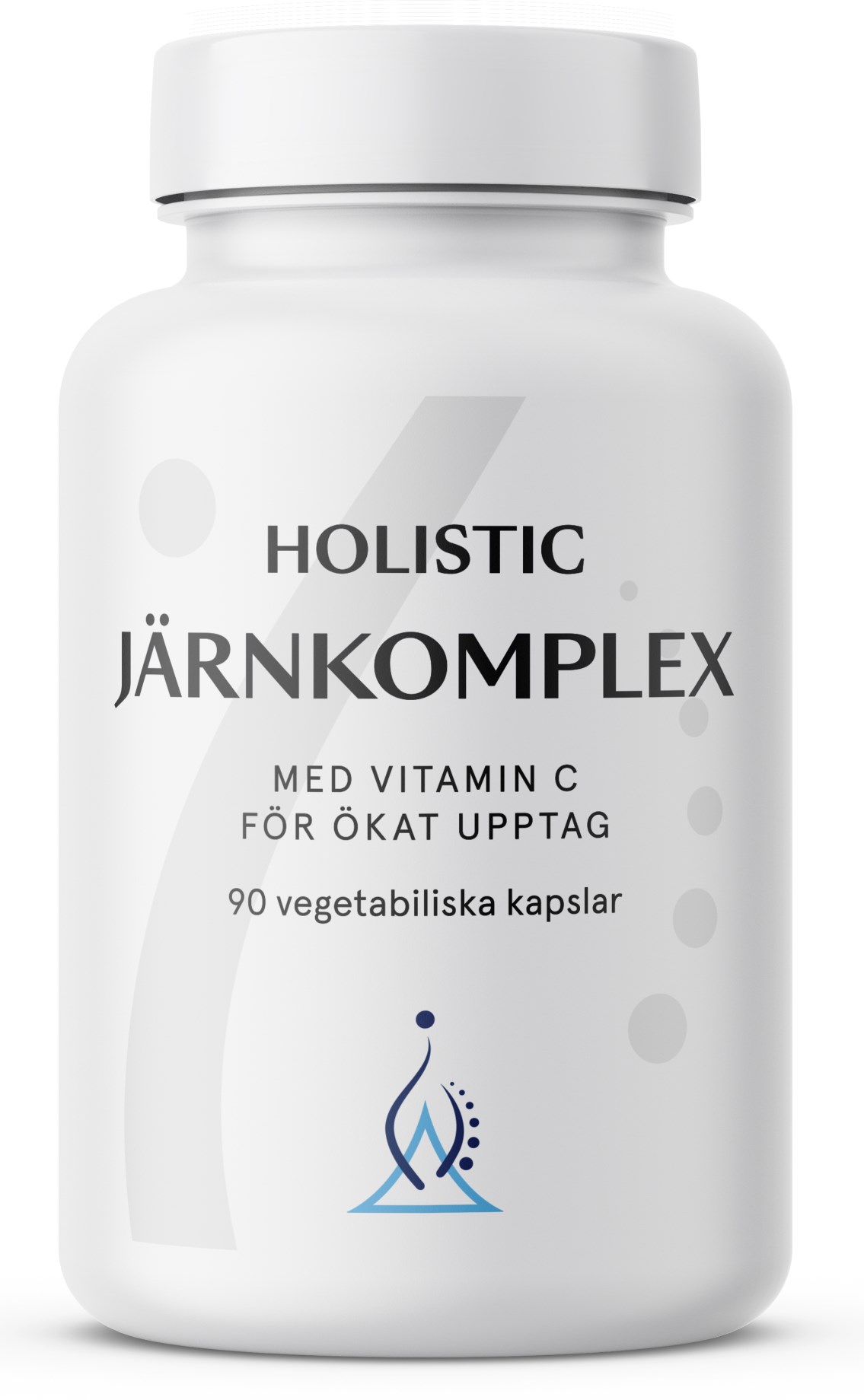 Holistic Jernkompleks er et tilskud med jern i form af jernbisglycinat og jernglukonat. Jern bidrager blandt andet til normal blodproduktion, til immunforsvarets normale funktion samt til at mindske træthed og udmattelse. Holistic Jernkompleks indeholder desuden C-vitamin, som øger optagelsen af jern i kroppen.