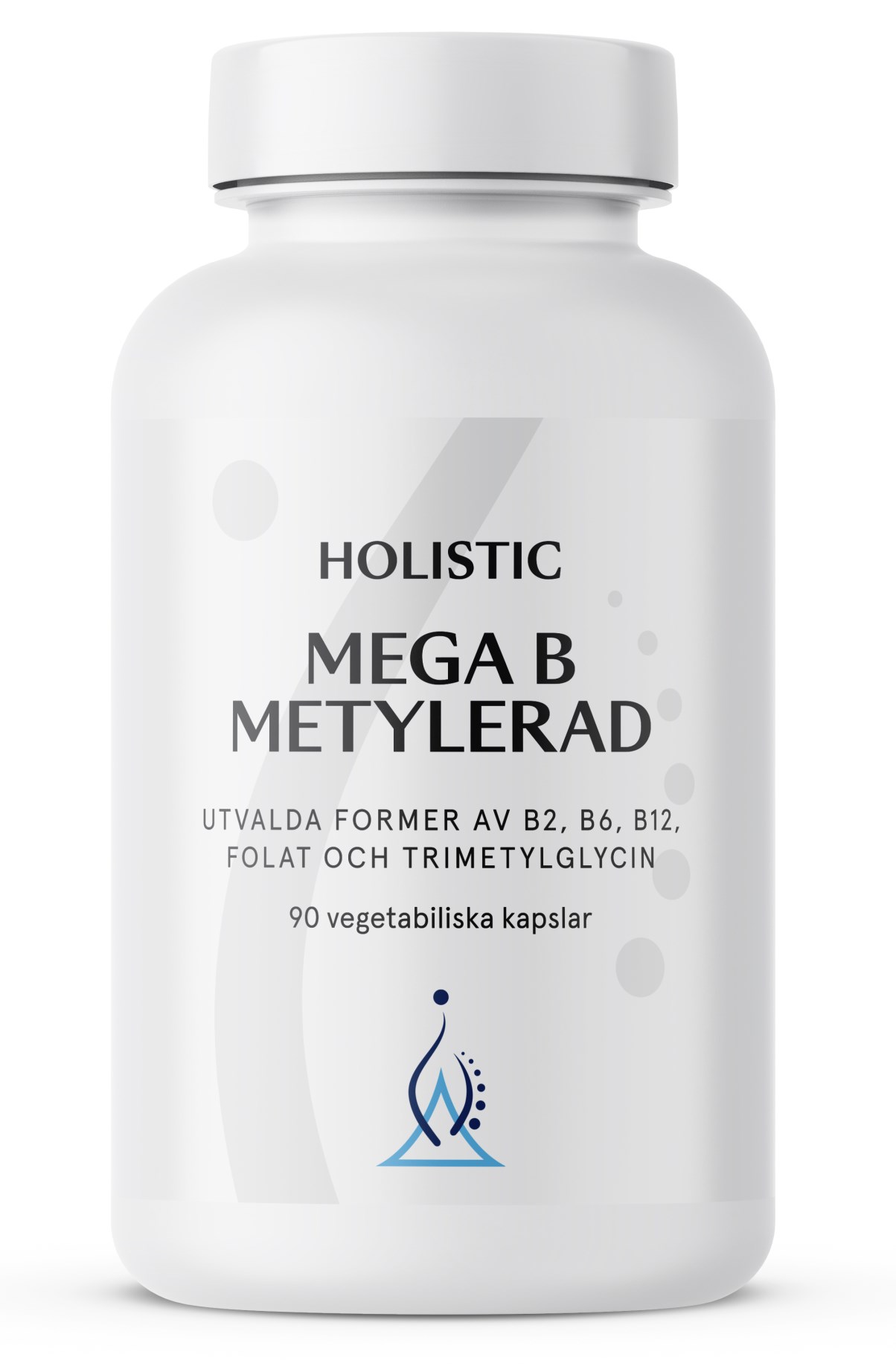 Holistic Mega B. Methyleret er et kosttilskud, der indeholder alle former for B-vitaminer. Tilskuddet indeholder særligt udvalgte former for B6, B12 og folat, som alle bidrager til immunforsvarets normale funktion samt reducerer træthed og udmattelse. B1, B2 og B3 bidrager til en normal energiomsætning og nervesystemets normale funktion. Holistic Mega B. Methyleret er også forstærket med methyldonor betain, inositol, PABA og cholin, som bidrager til en normal fedtomsætning og opretholdelse af leverfunktionen. B-vitamin er et fremragende tilskud til dig, der er meget aktiv eller af anden grund har et højt stofskifte, for at sikre et tilstrækkeligt indtag af B-vitaminer. B-vitaminer er vandopløselige og kan ikke lagres i kroppen, derfor har vi brug for at fylde på gennem kosten.