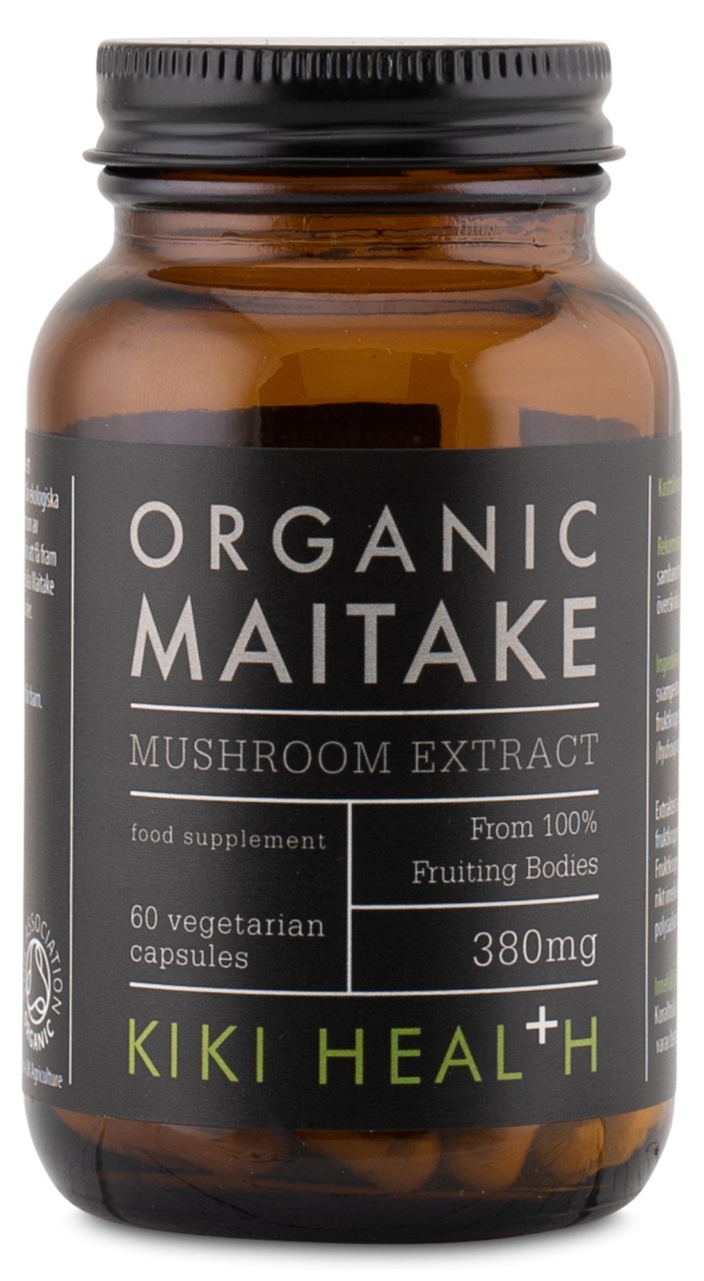 Kiki Health Organic Maitake Mushroom Extract er et økologisk og rent ekstrakt af maitakesvamp. Ekstraktet er udelukkende udvundet fra svampens frugtlegeme, hvilket er en god kilde til de aktive stoffer i svampen, herunder betaglukaner. Produktet er helt fri for tilsætningsstoffer og er vegansk.
