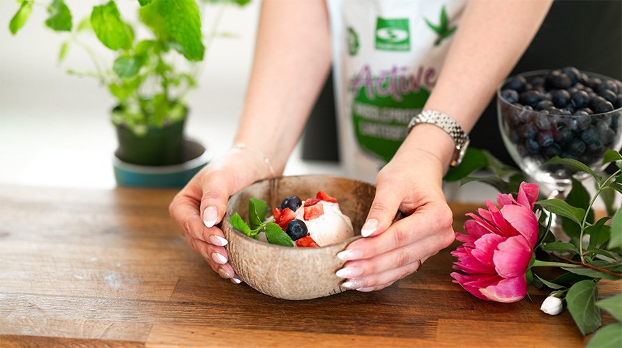 Sådan gør du: Bland vand og Healthwell Active Valleprotein Laktosefrit, Vanilje med en håndmixer eller i en blender i cirka 5 minutter indtil det bliver til fluff, tilsæt frosne jordbær og bland lidt mere afhængigt af hvor store stykker du ønsker af bærene. Top din yndlingsis med guf, og ekstra bær, og nyd!