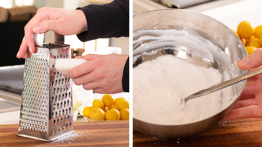 1. Riv sæben på et rivejern og bland i det lunkne vand.