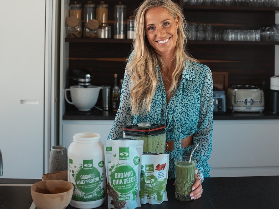 Lea Kessler giver dig her, hendes go-to smoothie med proteinpulver, chiafrø og super greens fra Healthwell.