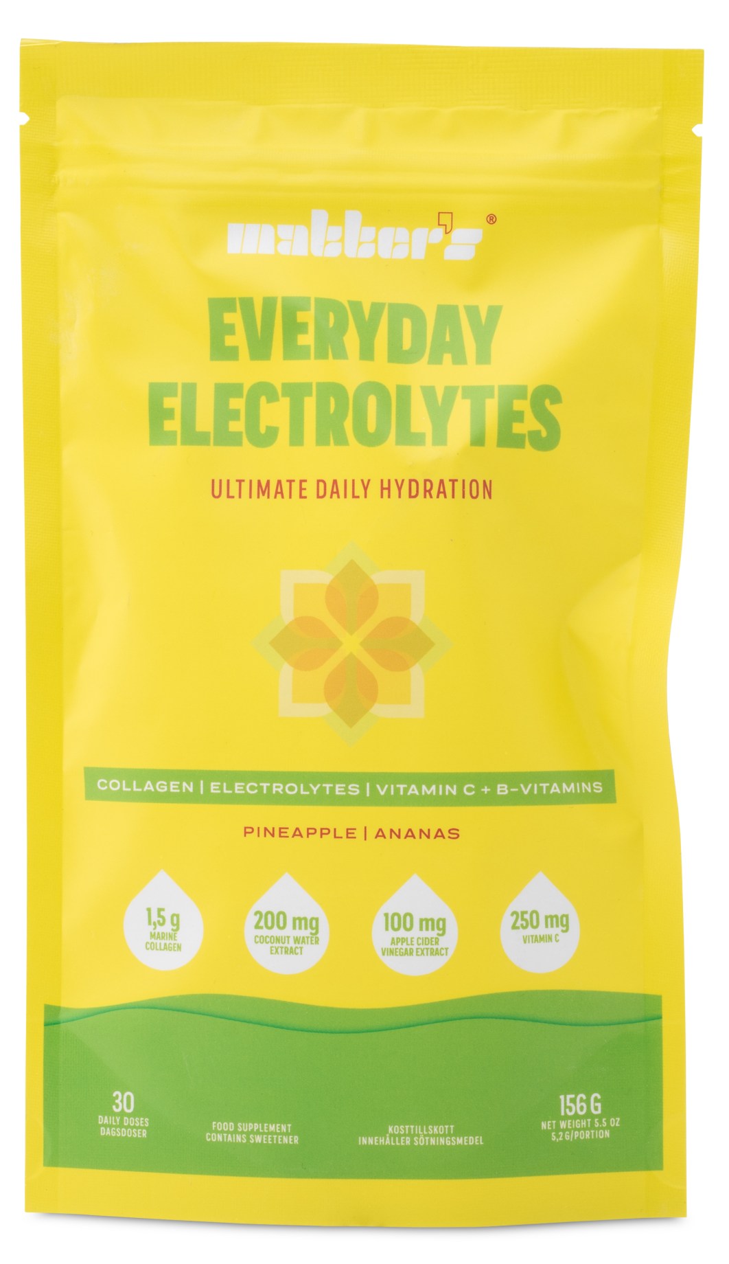 Matters Everyday Electrolytes er en unik elektrolytblanding designet til at optimere kroppens væskebalance og støtte velvære fra indersiden og ud. Elektrolytblandingen indeholder mineraler som natrium, kalium, calcium og magnesium fra naturligt havsalt med nærende kokosvandsekstrakt. Perfekt til restitution efter træning, på varme dage eller når hverdagen kræver lidt ekstra. Udover at genopfylde vigtige elektrolytter indeholder Everyday Electrolytes også marint kollagen, C-vitamin, hyaluronsyre og biotin for at give normal styrke og glans til dit hår, hud og dine negle. Beriget med æblecidereddike og inulin fra cikoriarod for at støtte en normalt fungerende tarmflora. Naturligt smagsat og sødet samt helt fri for kunstige tilsætningsstoffer. Måleske til dosering medfølger i hver pose.