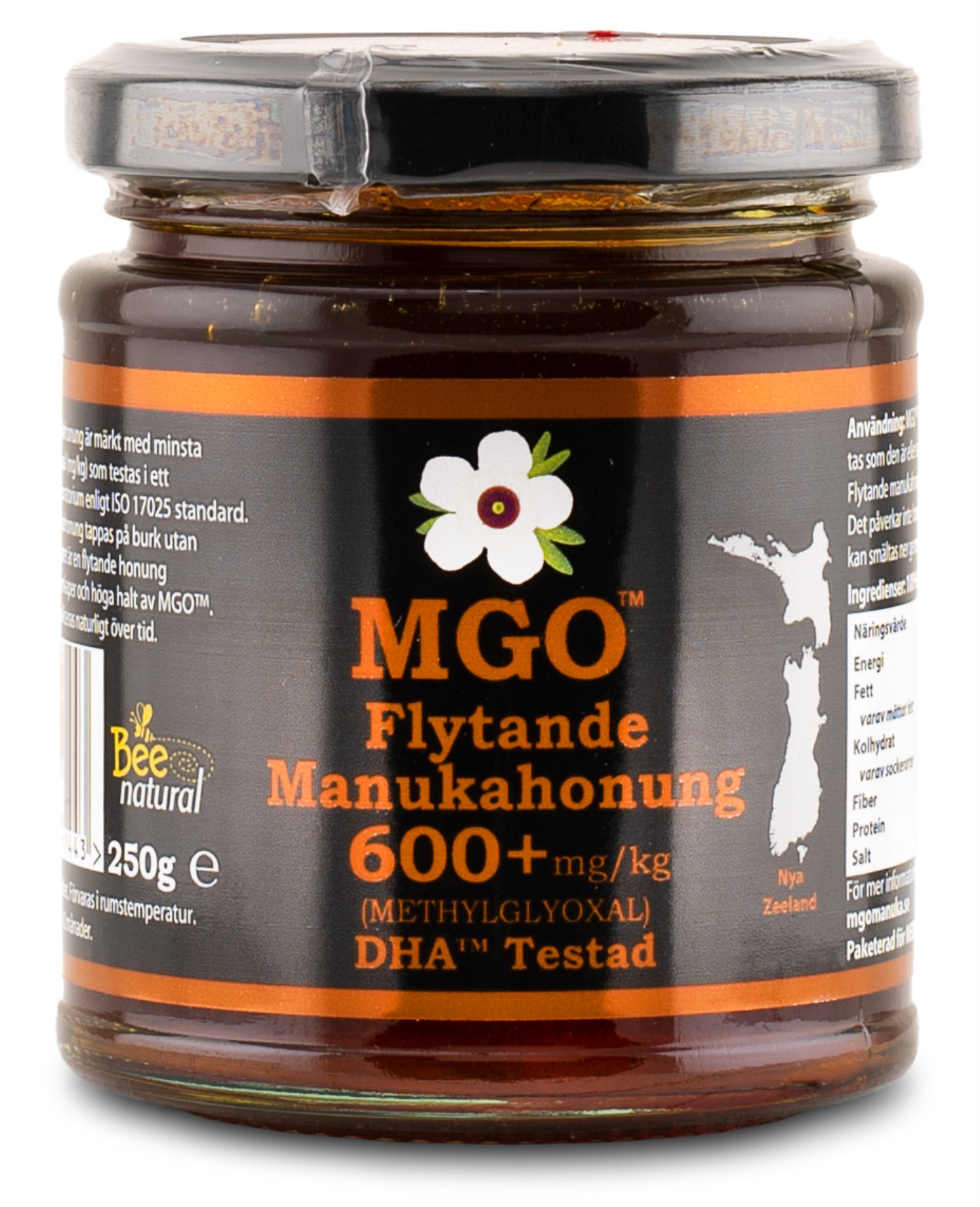 Nyd godt af manukahonningens sunde fordele med MGO Flydende Manukahonning 600+, som indeholder mindst 600 mg/kg methylglyoxal (MGO). En 100 % ægte manukahonning fra Leptospermum Scoparium, og som kommer fra New Zealand. Denne variant har en flydende konsistens, men bevarer de samme fantastiske egenskaber som den "almindelige" MGO Manukahonning 250 g. Flydende manukahonning krystalliserer naturligt, men det påvirker ikke dens kvalitet. Krystallerne kan nemt smeltes væk ved langsom opvarmning. For at garantere honningens kvalitet er indholdet af methylglyoxal testet i henhold til ISO 17035-standard i et uafhængigt laboratorium i Storbritannien.
