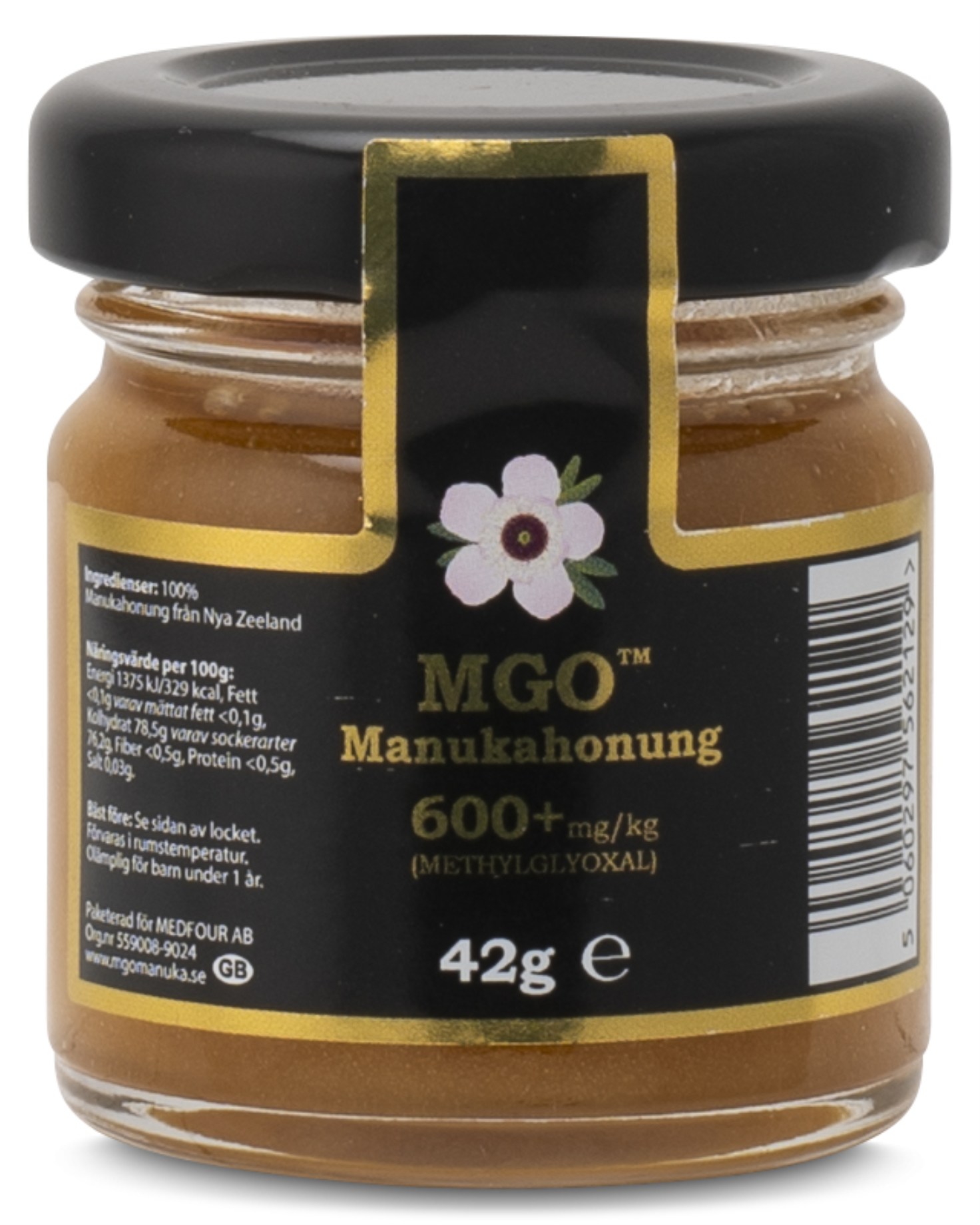Oplev ægte MGO® Manukahonning 42 g fra New Zealand i et praktisk glas – perfekt til dig, der vil prøve produktet eller nemt tage det med på farten. Ligesom det større glas MGO Manukahonning 250 g, indeholder det 100 % Leptospermum Scoparium Manukahonning og har en MGO-værdi på 600+, rig på det bioaktive stof methylglyoxal (MGO). Manukahonningen er naturligt sød og passer perfekt i mad, drikkevarer eller under forkølelsessæsoner. Honningen kommer fra nektar fra manukabuskenes blomster, der vokser i New Zealand og har en unik antibakteriel aktivitet, der adskiller den fra almindelig honning.