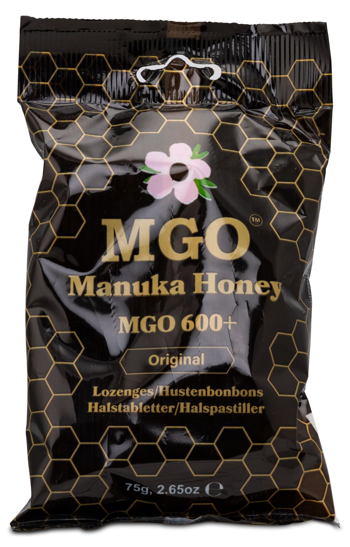 MGO Manuka Honning halstabletter 600+ er gode halstabletter med 15 % ægte manuka honning fra New Zealand. Manuka-honning er rig på stoffet MGO (methylglyoxal), som kan forhindre bakterier i at binde sig til celler. Den er derfor populær til irriteret hals. Disse halstabletter indeholder mindst 600 mg MGO per kilogram, er beroligende for mundhule og svælg, og har en god og klar smag af honning.