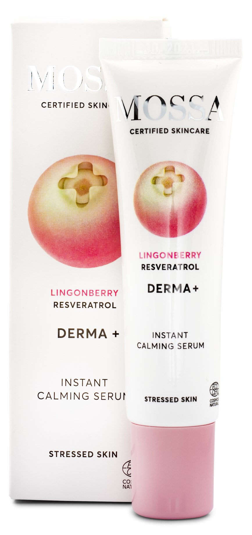 Mossa DERMA + øjeblikkelig beroligende serum lindrer stresset hud, har en dyb fugtgivende effekt og lindrer huden. Jojobaolie, hyaluronsyre, økologisk tranebærekstrakt og andre fugtgivende ingredienser arbejder for at øge vital fugtighed og reducerer hudens ubehag. Dette serum beskytter mod ydre miljøpåvirkninger ved hjælp af resveratol, som er det kraftige molekyle i lingonbær, men også vitamin C og E. Et perfekt serum til dig, der vil fugte huden og modvirke aldringstegn.