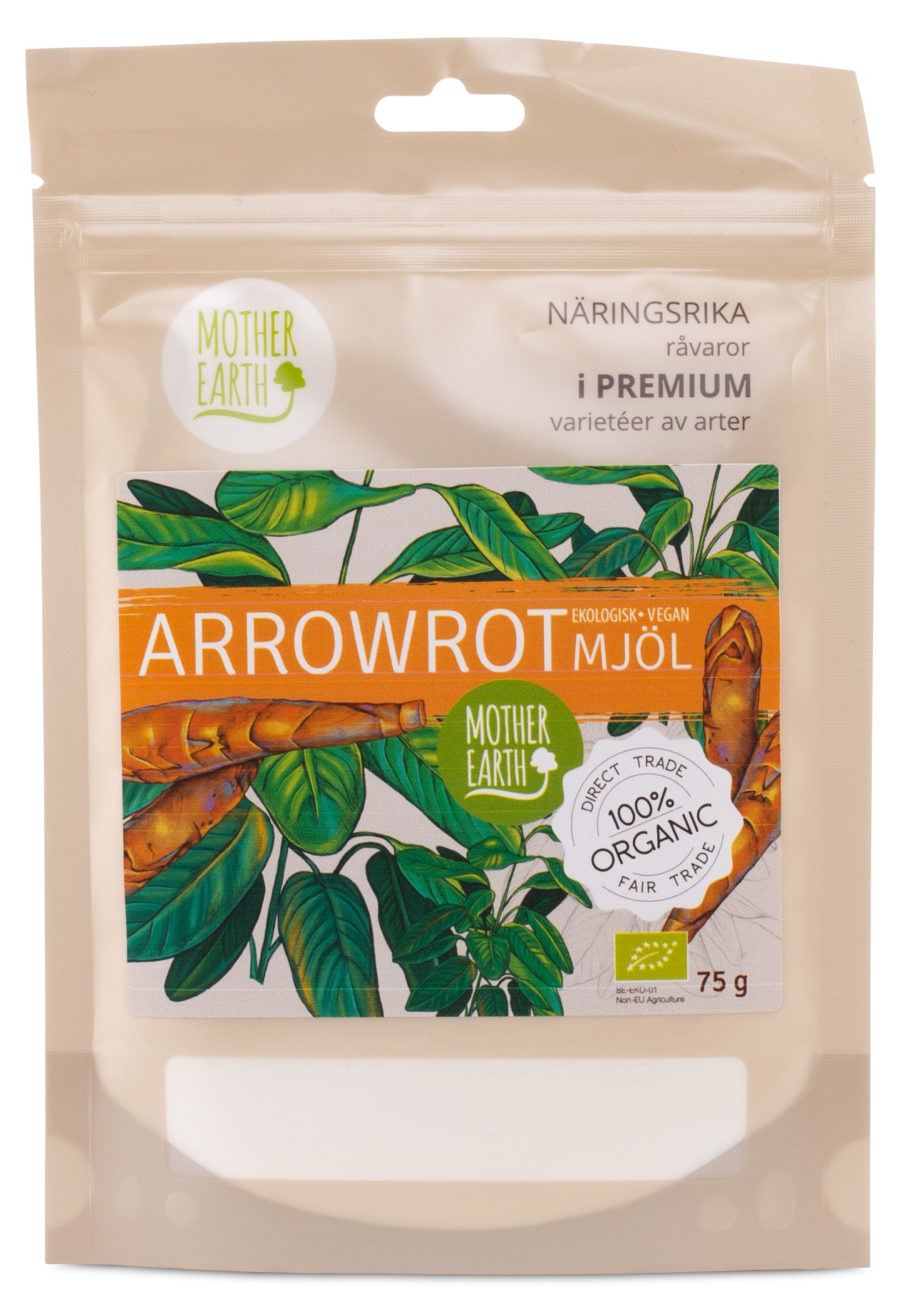 Mother Earth Arrowroot Powder ØKO er et pulver, der fremstilles af arrowroot, en flerårig plante, hvis lange, hvide jordstængler anvendes til at producere pulveret. Det fremstilles ved omhyggeligt at skrælle og male jordstænglerne. Herefter blandes det med vand, og en del af vandet presses ud gennem et stykke stof. Den grødede masse, der er tilbage, tørres og males derefter til pulver. Mother Earth Arrowroot Powder ØKO har mange anvendelsesmuligheder, blandt andet som jævning i saucer, bagning og andre retter. Du kan også bruge pulveret til panering og friturestegning. Det er smagløst og giver en gennemsigtig overflade. Arrowroot-pulveret tykner ved lavere temperaturer, men mister sin jævneevne, hvis det koger for længe.