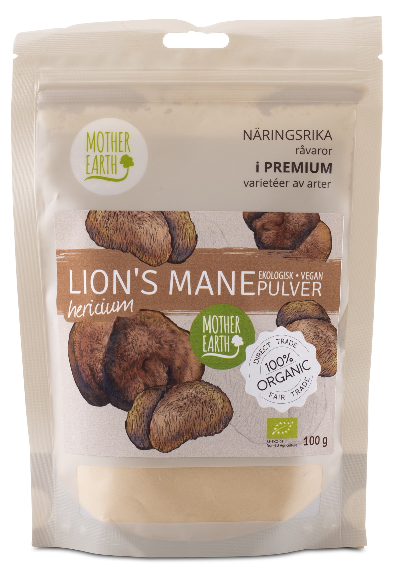 Lion's Mane Pulver Øko fra Mother Earth indeholder pulver fra svampen lion's mane, eller pindsvinepigsvamp, som den også kaldes i Danmark. Den vokser primært på gamle eller døde løvtræer i Asien. Lion's mane er rig på antioxidanter, polysaccharider og beta-glukaner. Den har længe været brugt som medicinsvamp i den kinesiske kultur og siges at have mange interessante egenskaber.