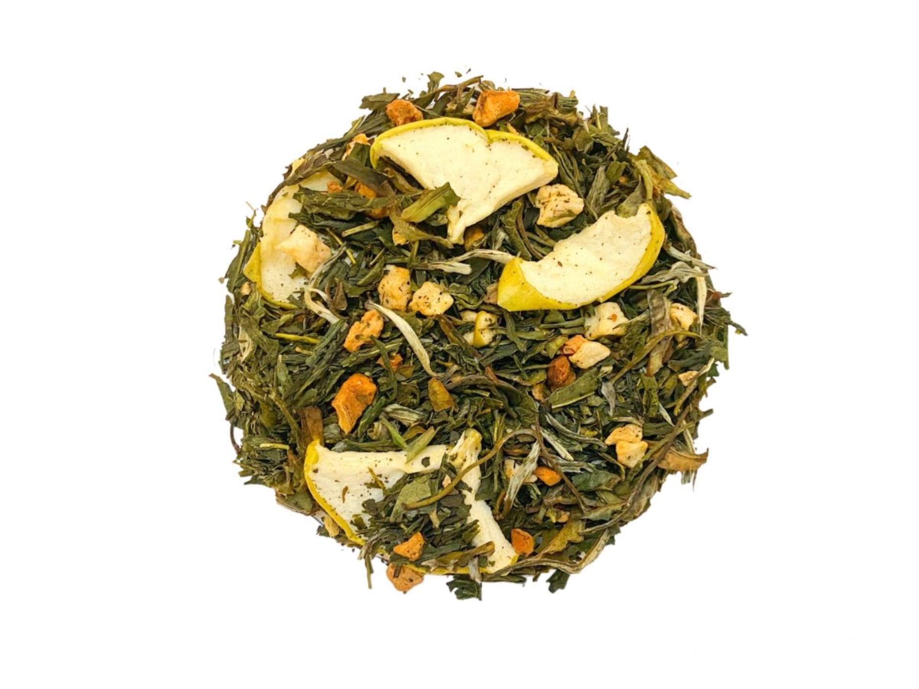 Oplev den spændende blanding af grøn og hvid te med Mr. Salwator Løs Te Sencha Ingefær & Æble. Grøn te giver en frisk og naturligt opløftende base, mens den hvide te skaber en perfekt balance. Sammen med generøse mængder skiver og stykker af æble får du en naturlig sødme, mens ingefæren giver en varmende og forfriskende tone i hver tår. For at løfte smagsoplevelsen yderligere er der tilsat brombærblade og frysetørrede æblestykker, som ikke kun bidrager til en smuk præsentation, men også fremhæver æblets friske og søde smag. Perfekt når du føler, at du har brug for afslapning eller når du ønsker en forfriskende drik, når som helst på dagen.
