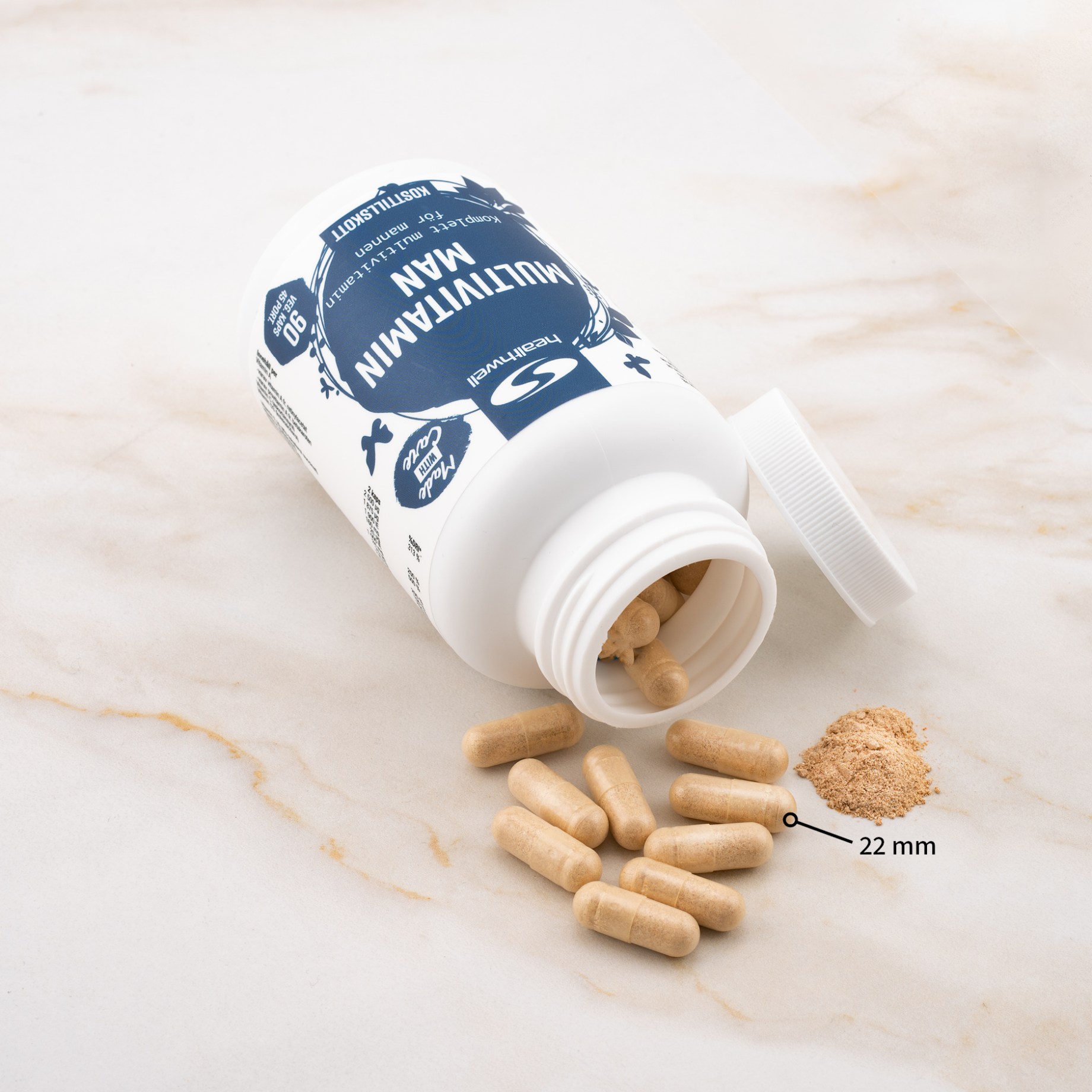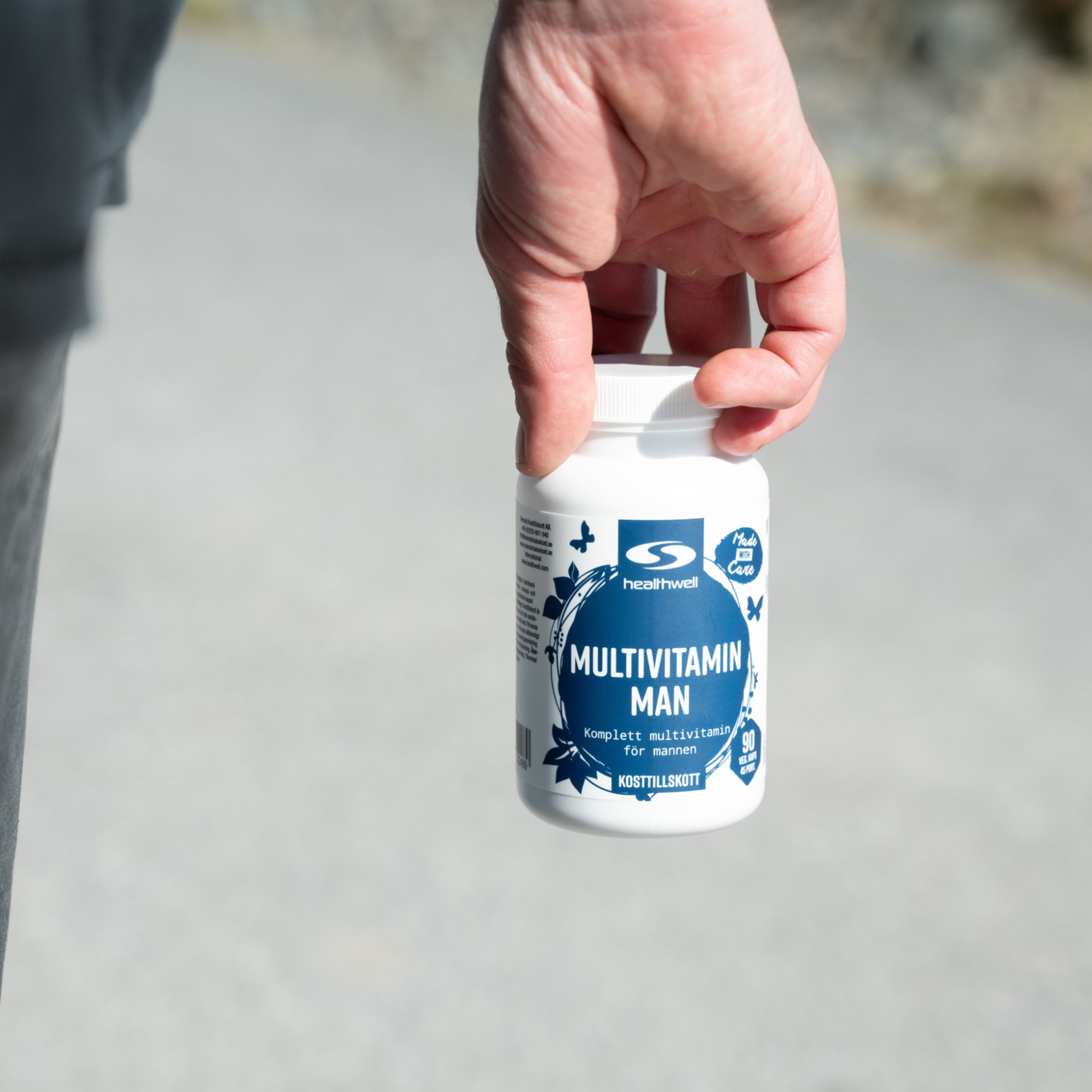 Multivitamin Man er et komplet multivitamin- og multimineraltilskud, som er specielt tilpasset til mandens behov, med et urte-, grøntsags- og frugtkompleks. To kapsler om dagen af dette multivitamin giver dig den anbefalede daglige indtagelse af de vigtigste vitaminer og mineraler, til en sundere livsstil. Healthwell Multivitamin Man indeholder blandt andet D3-vitamin, som vi oftest får via solens stråler, og som er en vigtig byggesten for cellevækst og nervesystemts normale funktion.