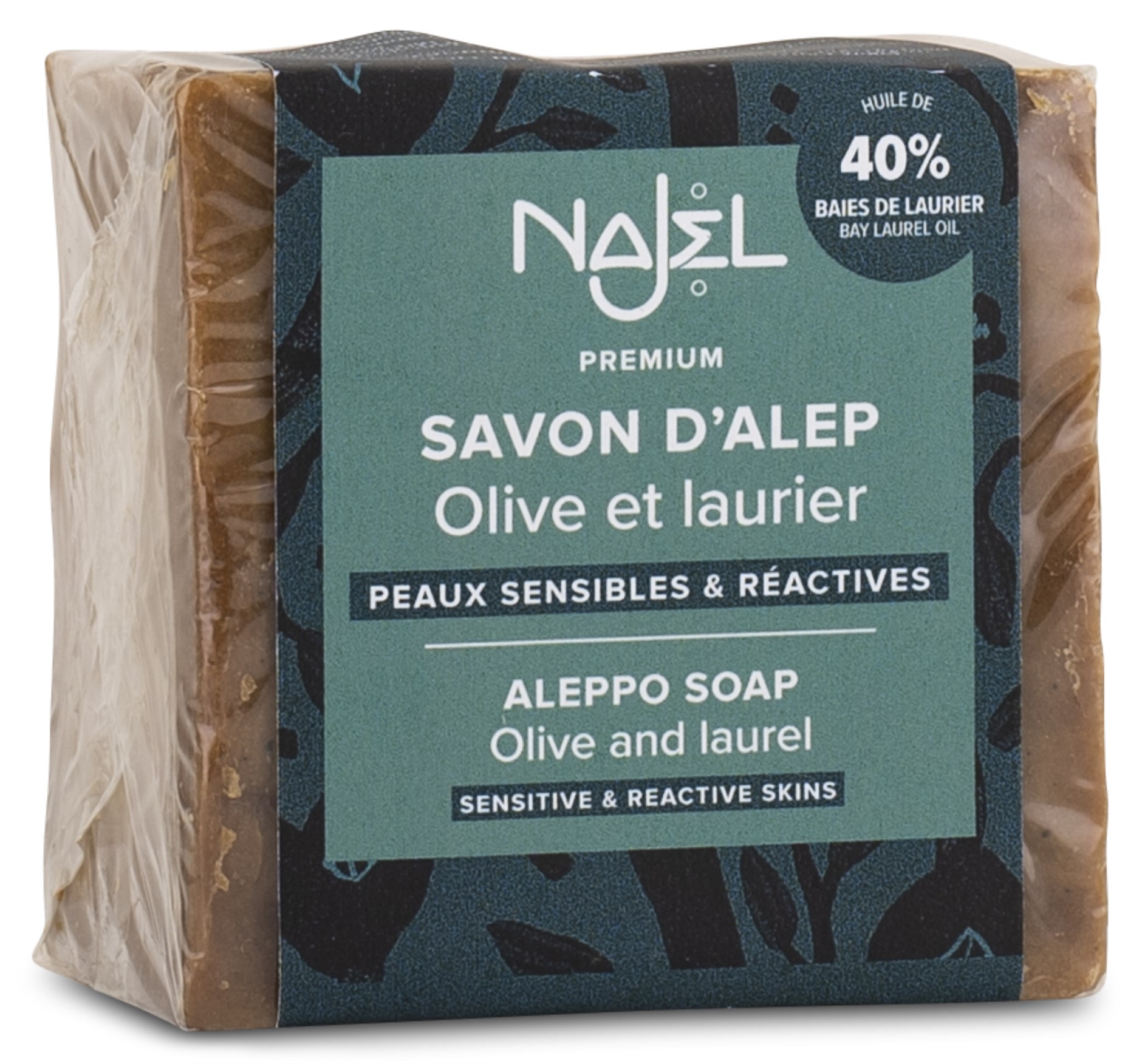 Vask ansigt, krop og hår med Najel Aleppo Soap 40%, en mild og fugtgivende Aleppo sæbe. Denne sæbe består af 40 % laurbærolie og er fremstillet ved hjælp af en varm sæbefremstillingsproces med 100% olivenolie og laurbærolie. Sæben er velegnet til følsom og reaktiv hud og har beroligende egenskaber. Jo højere koncentration af laurbærolie, jo mere beroligende er sæben til hudproblemer.