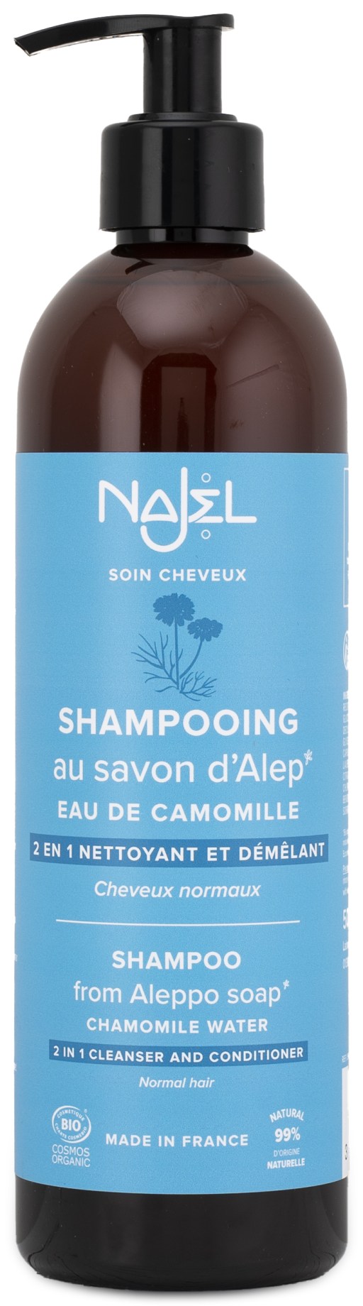 Najel Aleppo sæbe 2 i 1 Normal Hair er en shampoo og balsam i ét, udviklet til dig med normalt hår. Indeholder Alepposæbe i kombination med økologisk kamillehydrolat, som efterlader håret blødt og med en vidunderlig glans. En sulfatfri formel, der passer til hele familien! Shampooet er COSMOS-certificeret af EcoCert Greenlife.