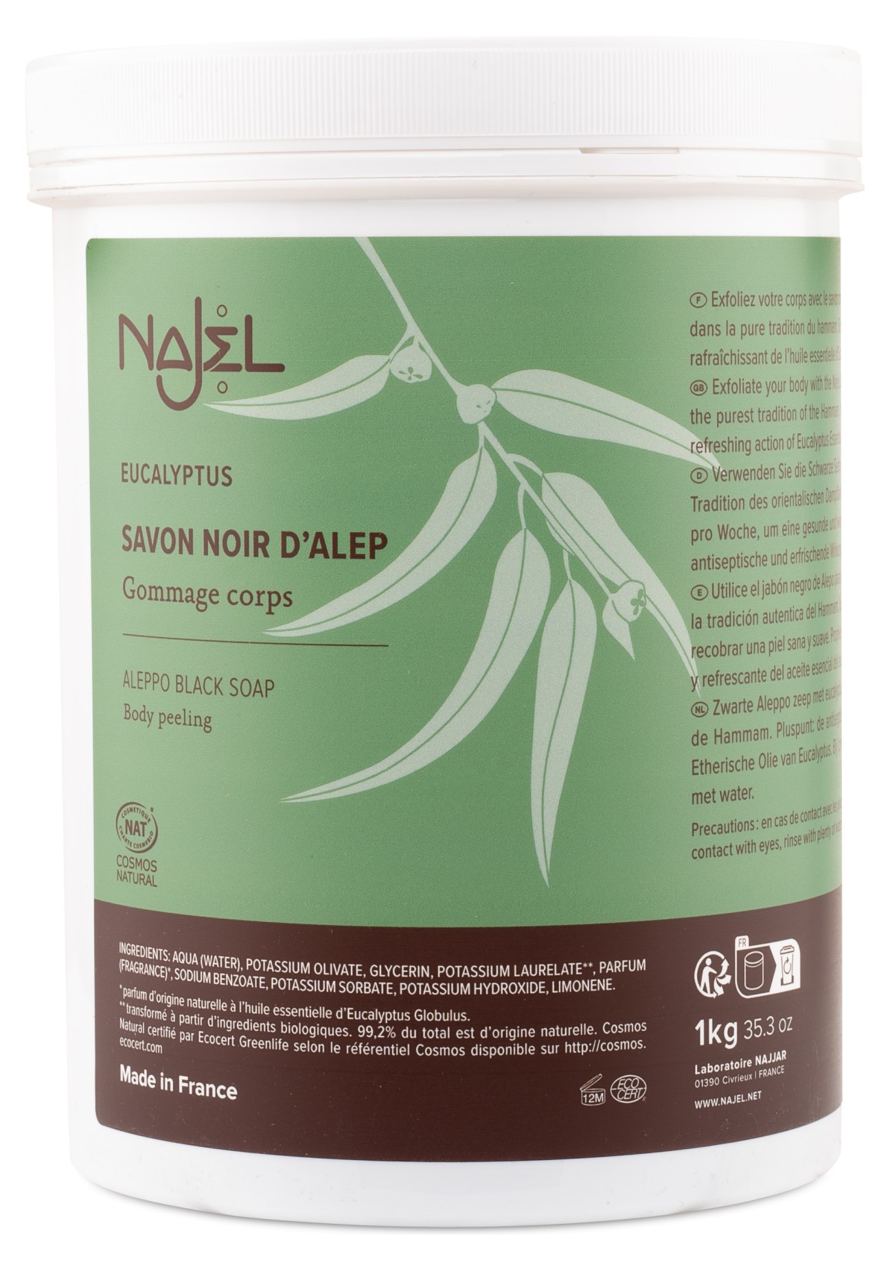 Najel Black Aleppo Soap er en sort Aleppo-sæbe, fremstillet af økologisk jomfruolivenolie og laurbær for en naturlig og skånsom rengøring. Den eksfolierende sæbe er kornfri og skånsom mod huden, egnet til alle hudtyper. Beriget med æterisk Eucalyptus globulus-olie for en frisk duft og opfriskende følelse. Brug som den er eller sammen med en skrubbehandske eller svamp for at eksfoliere huden i dybden.