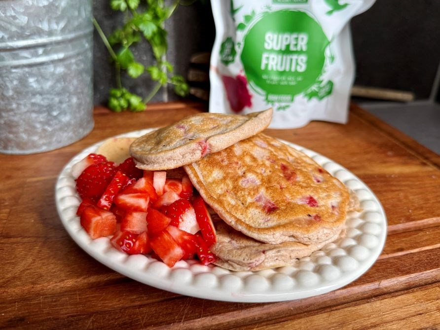 Prøv Annie Erfass' (Kalorismart) lækre bærpandekager med æggehvideskum for ekstra fluff! Jordbær og super blandingen Healthwell Super Fruits, som er fyldt med næringsstoffer fra mange forskellige røde bær og frugter, giver en ny version af de klassiske pandekager med deres bærsmag, smukke lyserøde farve og ekstra boost af næring. Klar på kun 15 minutter!
