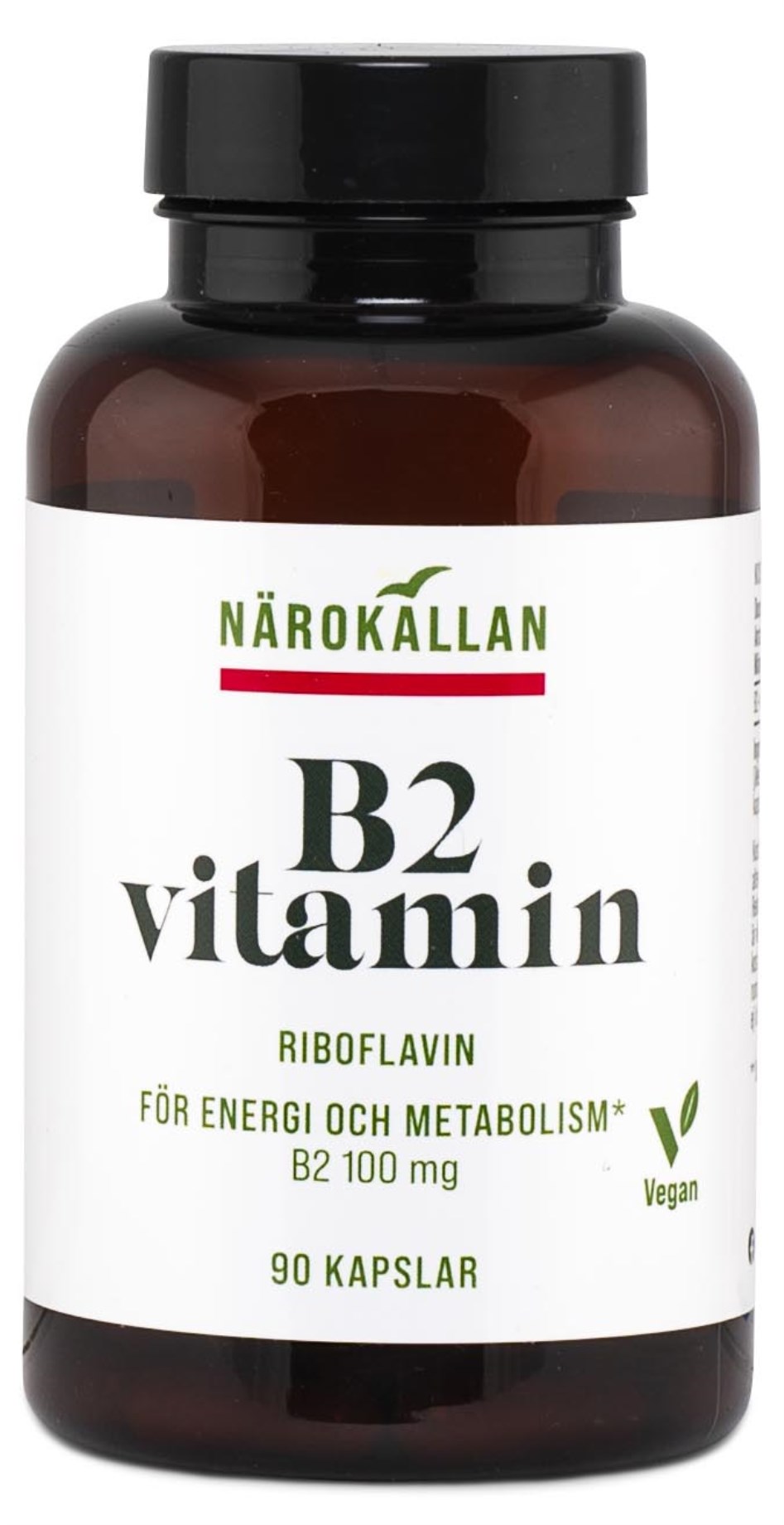 Riboflavin, vitamin B2, er et vitamin med flere vigtige funktioner i kroppen. Det bidrager blandt andet til normal stofskifte og nedbrydning af fedt, kulhydrater og protein. Det bidrager også til normalt fungerende nerver samt til normal hud. Riboflavin fra Närokällan indeholder 100 mg riboflavin per kapsel.