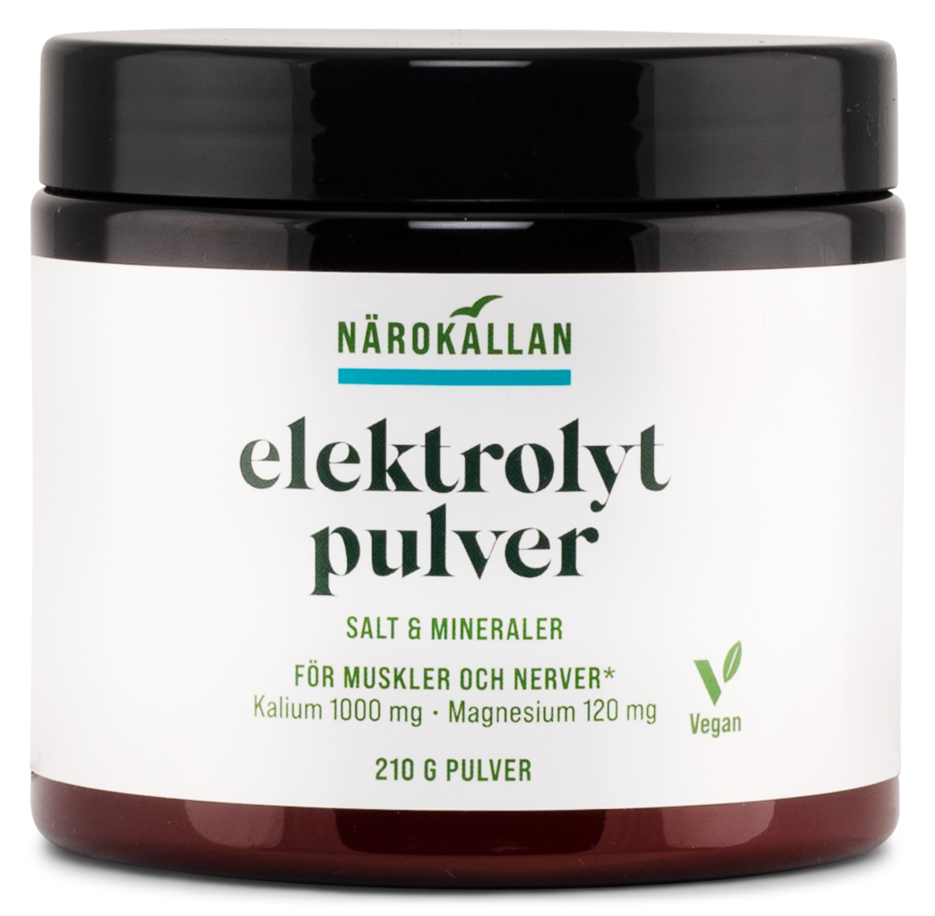 Närokällan Elektrolytpulver indeholder 1000 mg kalium per dosis, der sammen med andre mineraler understøtter væskebalancen i kroppen. Kalium er blandt andet godt for energiniveauet. Godt at anvende i forbindelse med meget træning, eller hvis du sveder meget, eller for dig der har behov for ekstra mineraler i din kost. Kan let opblandes i et glas vand.