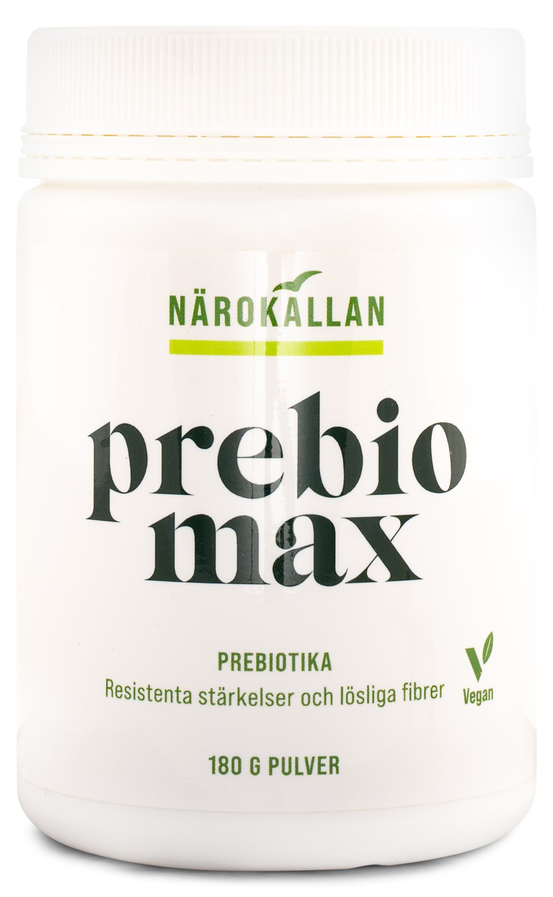 PrebioMax fra Närokällan er et kosttilskud med prebiotika. Prebiotika består af fibre, der fungerer som næringsstoffer til tarmbakterierne, som fremmer tarmfloraen og giver den mulighed for at trives. Mavens bakterier er en del af vores immunsystem, som beskytter os mod skadelige bakterier. Prebiotika er også bæredygtige gennem fordøjelsessystemet og bryder ikke ned i mave-tarmkanalen, men overlever hele vejen til tarmene, hvor de gør godt. PrebioMax indeholder blandt andet fibre fra agave, acacia, cikorie og grøn banan. PrebioMax er et pulver, som du kan blande med væske eller drysse over din mad.