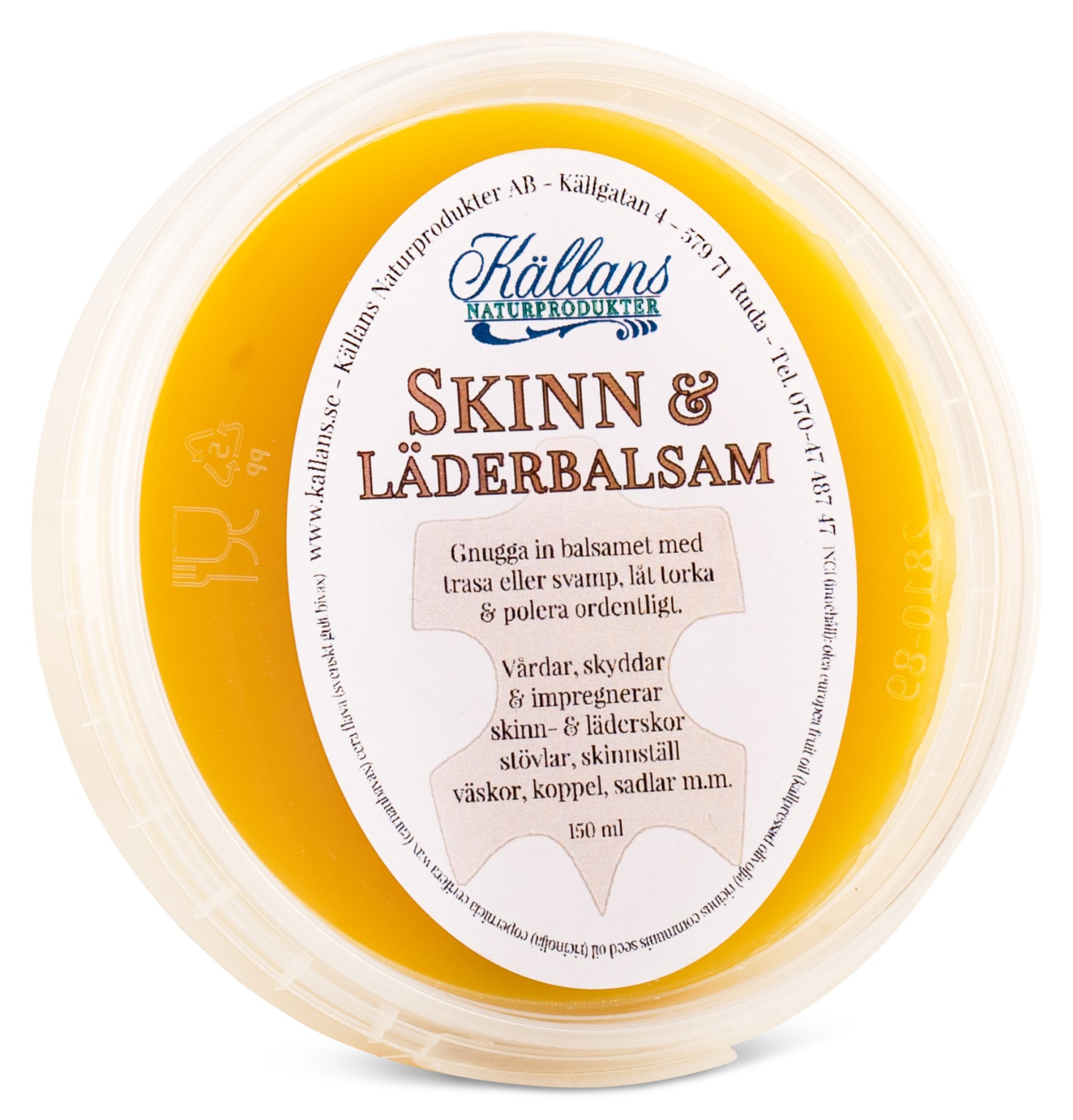 Källans Naturprodukter Skinn & Læderbalsam er en naturlig balsam, som blødgør, imprægnerer og beskytter læder og skind. Perfekt til brug på skindsofaer, tasker, sadler og sko m.m. Källans Skinn & Læderbalsam er lavet af vegetabilske ingredienser samt svensk bivoks. 100 % naturlig, miljøvenligt og lokalproduceret!