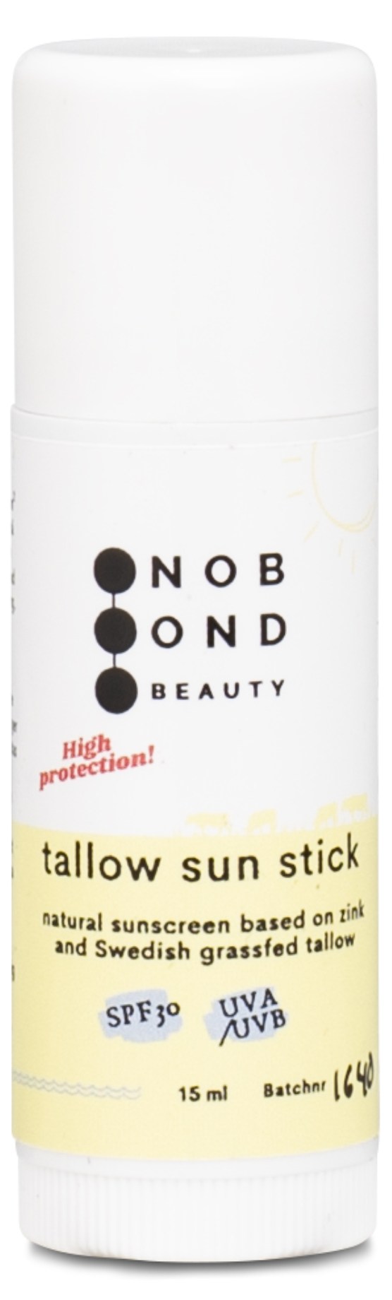 No Bond Beauty Tallow Sun Stick er en fysisk solbeskyttelse baseret på non-nano zinkoxid og titandioxid, som giver høj beskyttelse mod UVA og UVB. Med en base af svensk talg beskytter den mod solens stråler samtidig med, at den efterlader huden blød og smidig. Tallow Sun Stick er testet i overensstemmelse med gældende regler og opfylder kravene til høj solbeskyttelse SPF 30, bredspektret beskyttelse samt UVA- og UVB-stråling. Mineralsk solbeskyttelse bliver på huden og reflekterer solens stråler i stedet for at trænge ind i huden. Solbeskyttelsen egner sig til hele kroppen.