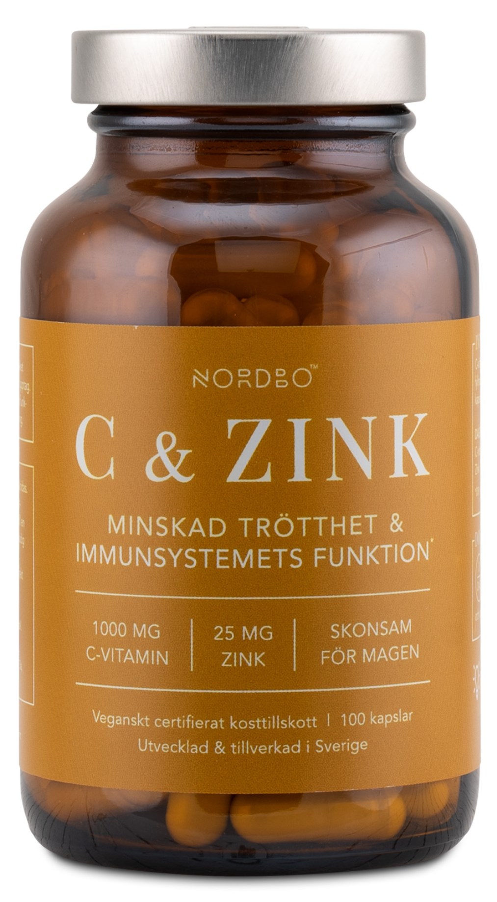 Nordbo C-vitamin & Zink er et kosttilskud med C-vitamin og zink i letoptagelige former. Tilskuddet indeholder syreneutral og højdoseret C-vitamin i form af calciumascorbat, som både er biotilgængelig og skånsom for maven. Zinket er i form af zinkpicolinat, hvilket er en form, der er ekstra let for kroppen at optage. Både C-vitamin og zink bidrager til immunforsvarets normale funktion, til at bevare normal knoglestruktur samt til at beskytte cellerne mod oxidativ stress. Nordbo C-vitamin & Zink er svenskproduceret, vegansk og godkendt af Djurens Rätt.