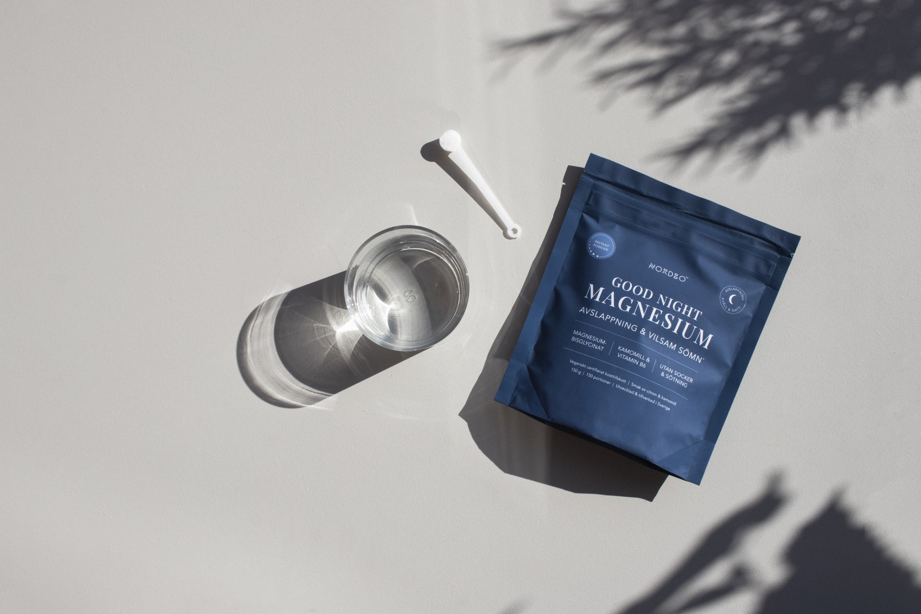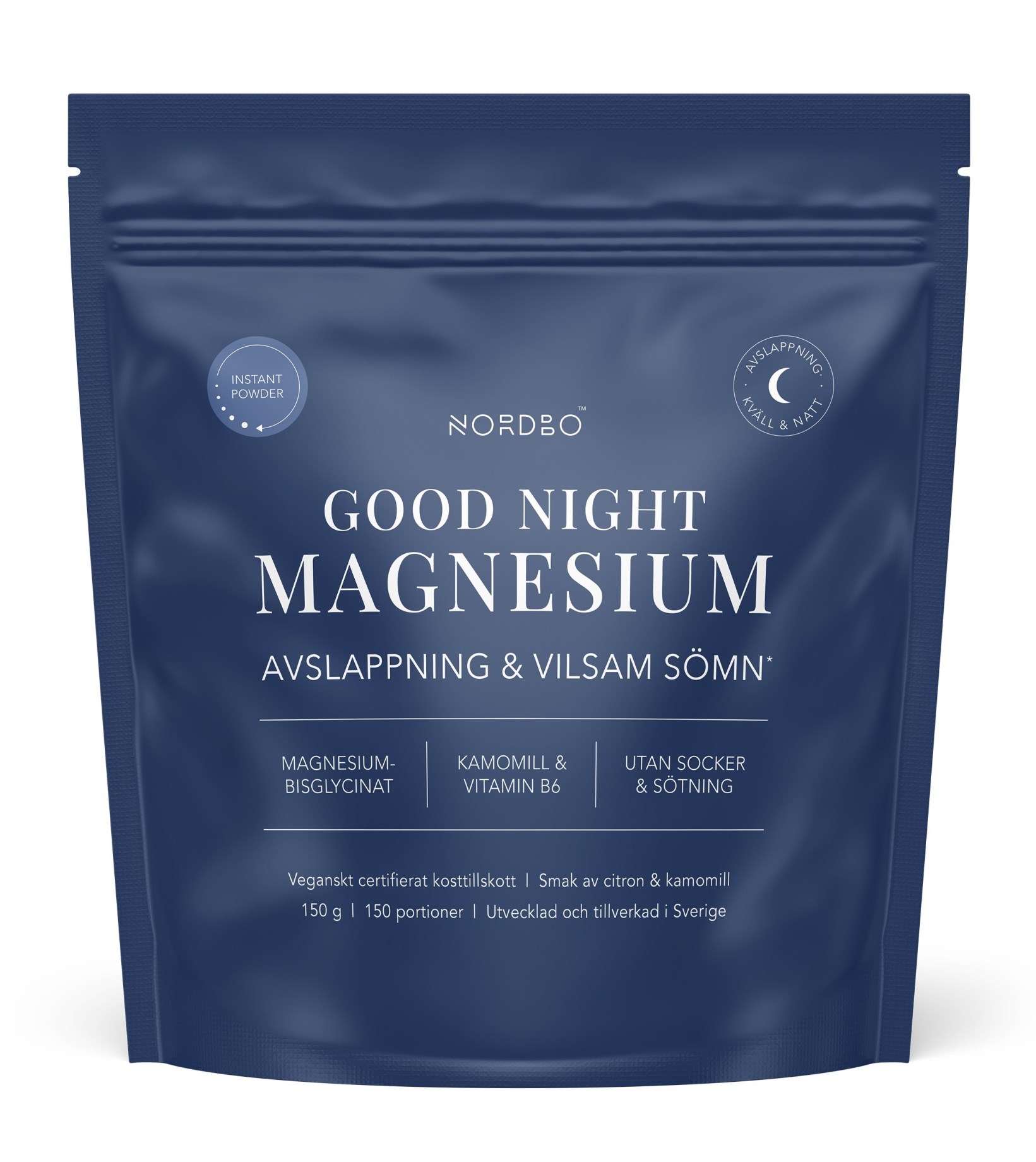 Afslut dagen med et glas Good Night Instant Magnesium fra Nordbo, et magnesiumpulver specielt til aftenen. Det indeholder magnesiumbisglycinat med høj biotilgængelighed og er skånsomt for maven. Magnesium bidrager til normal nerve- og muskelfunktion og er blandt andet involveret i musklernes evne til afslapning. Derudover indeholder det vitamin B6, som bidrager til normal psykologisk funktion, samt kamilleekstrakt. Pulveret opløses let i vand og har en god smag af citron og kamille, helt uden andre tilsætningsstoffer eller sødestoffer. Fremstillet i Sverige og certificeret som vegansk af organisationen Djurens Rätt.