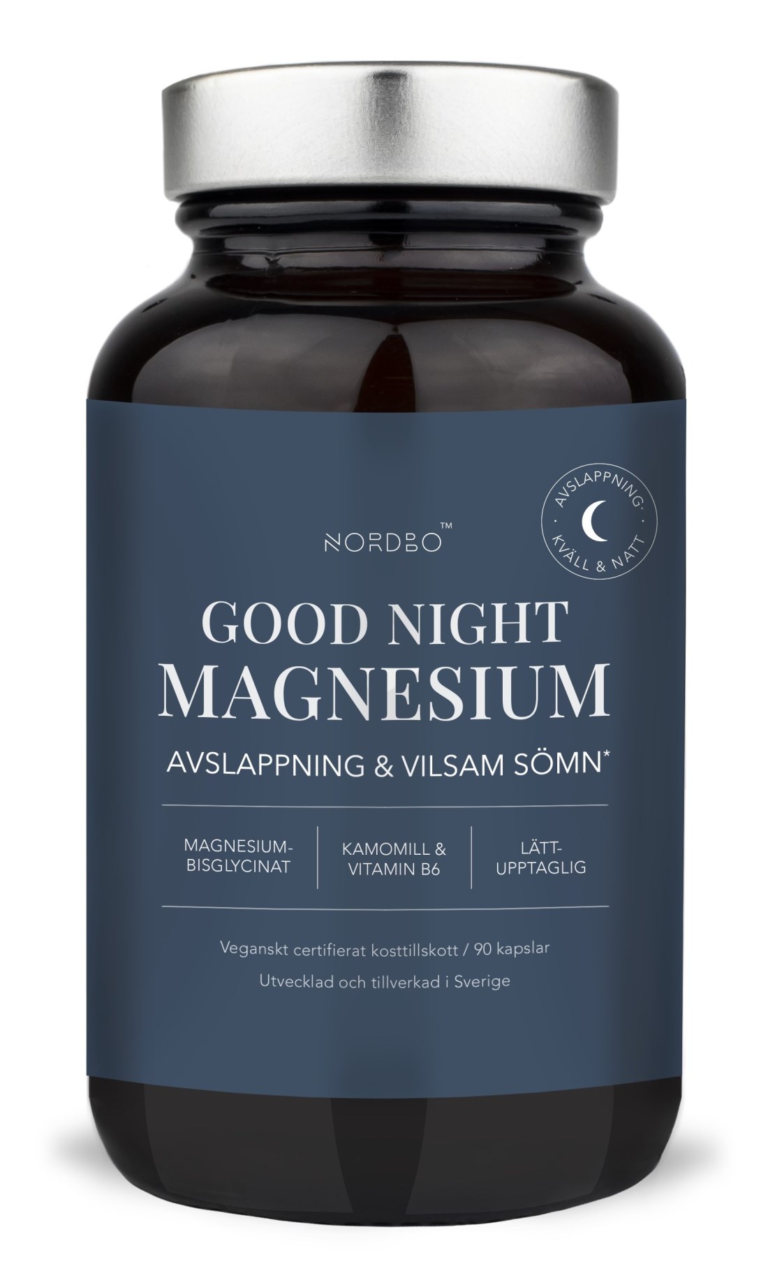 Good Night Magnesium fra Nordbo indeholder en formel af letoptageligt magnesiumbisglycinat, kamilleekstrakt og vitamin B6 - en kombination, der er perfekt til aften og nat! Magnesiumbisglycinat er en magnesiumform, der er bundet til aminosyren glycin, hvilket giver forbedret optagelse og gør det skånsomt for maven. Mange oplever, at kamille giver afslapning og en rolig søvn. Desuden er det kendt for at bidrage til mentalt og fysisk velvære!