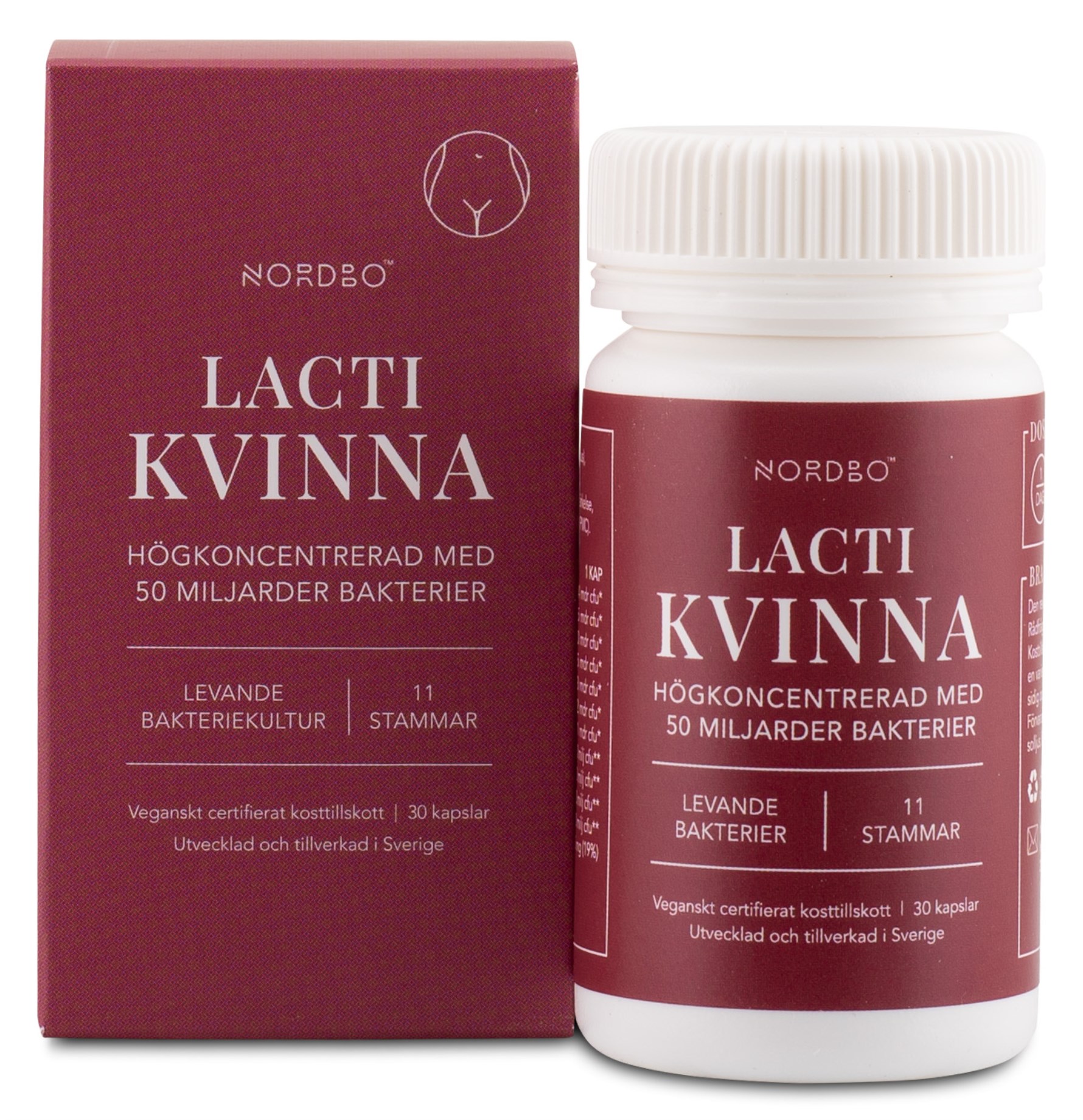Nordbo LactiKvinna er et kosttilskud med mælkesyrebakterier, specielt udviklet til at støtte kvinders generelle og vaginale sundhed. Dette tilskud indeholder hele 50 milliarder mælkesyrebakterier fra 11 forskellige stammer, hvoraf hele 90 % er Lactobacillus-bakterier. Det indeholder også syreneutral C-vitamin, som er skånsomt for maven og bidrager til immunforsvarets normale funktion. Nordbo LactiKvinna er fri for laktose, mælk og gluten samt certificeret med I'm Vegan af Djurens Rätt.