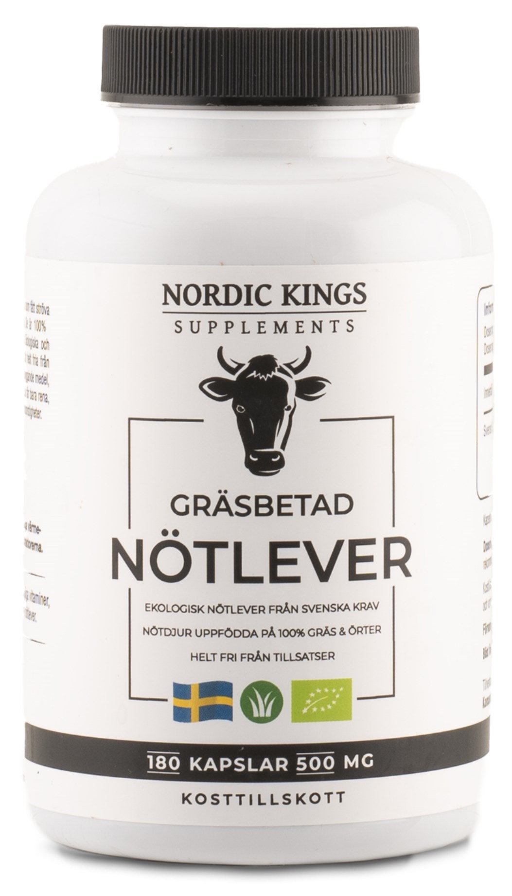 Nordic Kings Græsfodret Okselever ØKO er kapsler med okselever fra græsfodrede, svenske kvæg. Dyrene er opdrættet på en kost bestående af 100 % græs og urter, uden tilsætning af kornfoder som soja, hvede eller majs. Okseleveren frysetørres nænsomt for at bevare dens høje næringsindhold og er fri for antibiotika, væksthormoner og pesticider. Lever er en fremragende kilde til A-vitamin i form af retinol, samt CoQ10, hæmjern, vitamin B12, cholin, folat og flere vigtige næringsstoffer. Kosttilskuddet er allergenfrit og indeholder ingen tilsætningsstoffer, fyldemidler eller bindemidler - kun næringsrig frysetørret okselever.