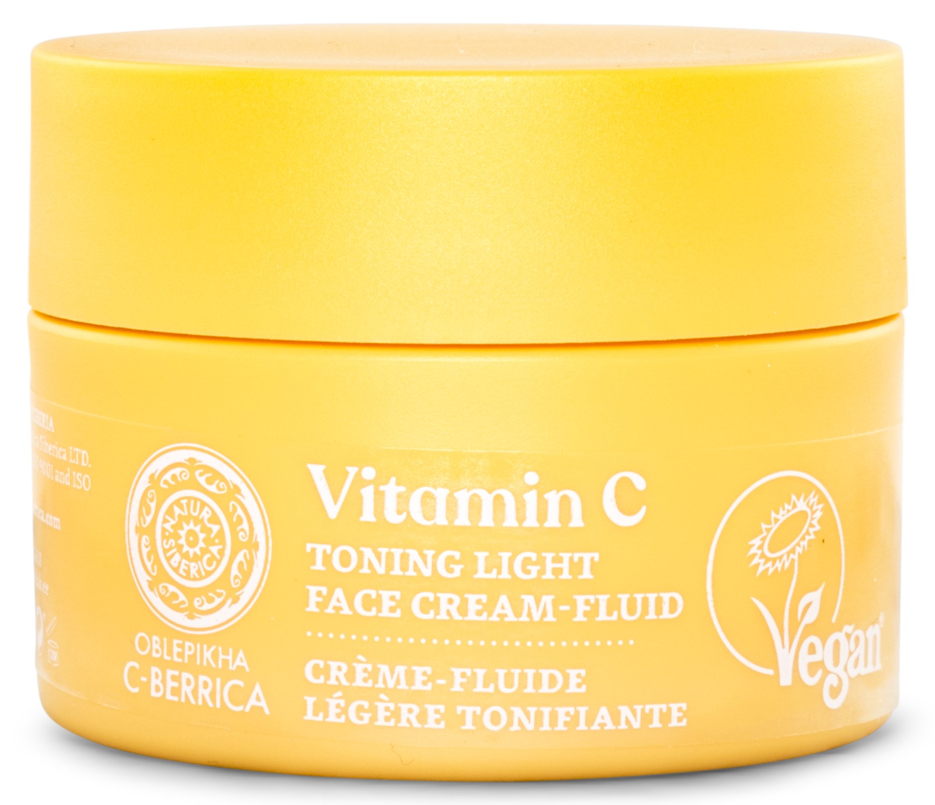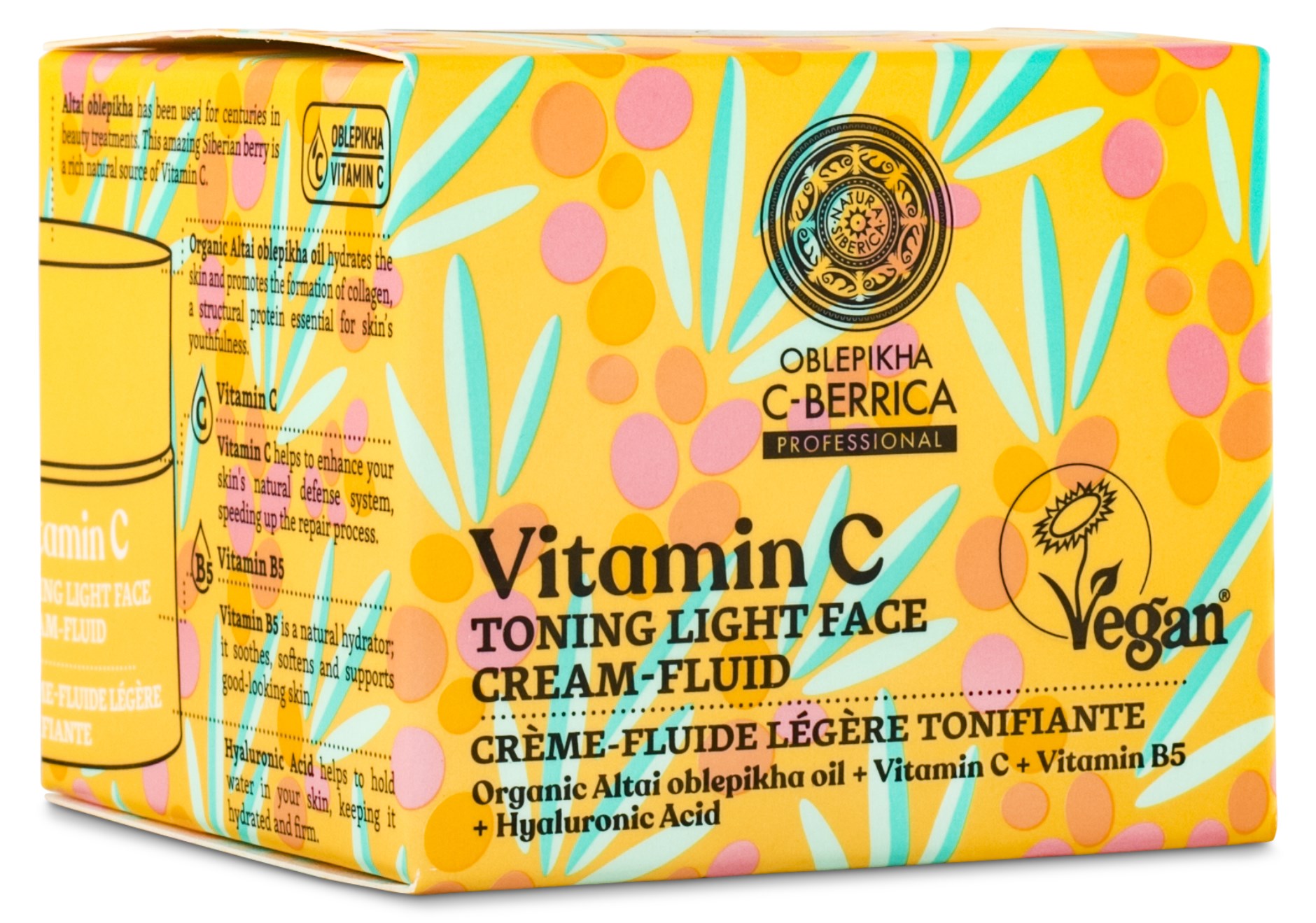 Oblepikha C-Berrica Toning Light Face Cream-Fluid er en vidunderlig ansigtscreme, der giver din hud energi og beskytter den mod skadelige ydre påvirkninger. Giver din hud en frisk og smidig følelse. Cremen indeholder blandt andet C-vitamin, havtorn og hyaluronsyre. Det fugter huden og styrker dens naturlige beskyttelse. Cremen er vegansk og miljøcertificeret.