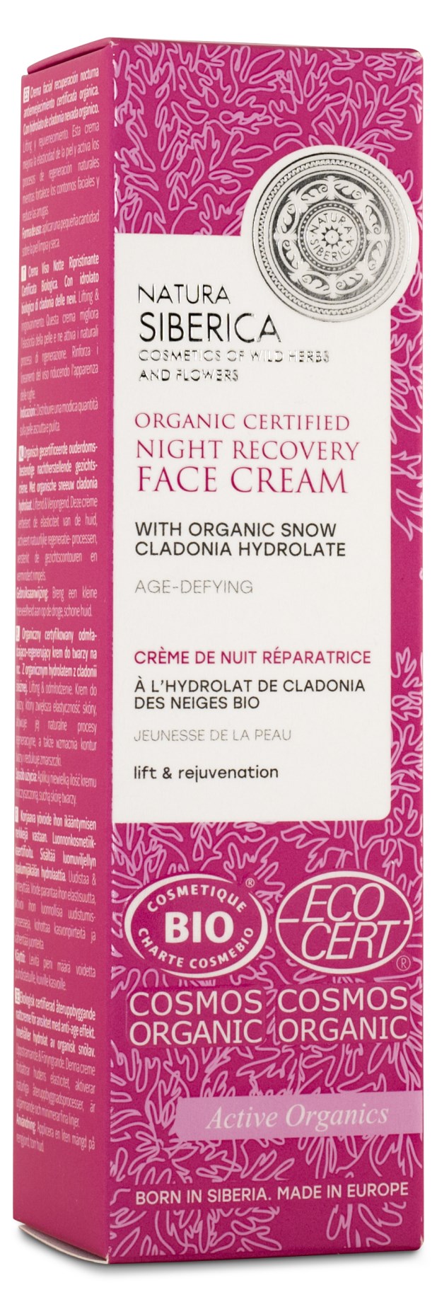 Organic Certified Age-Defying Night Recovery Face Cream er en fugtgivende natcreme med specielt udvalgte ingredienser for at opretholde en sund og ungdommelig hudfarve. Cremen får sin virkning fra den potente plante cladonia, sibirisk tallolie, E-vitamin og hyaluronsyre. Tilsammen hjælper disse ingredienser med at øge hudens elasticitet, aktivere hudens naturlige genopbygningsproces og reducere rynker.