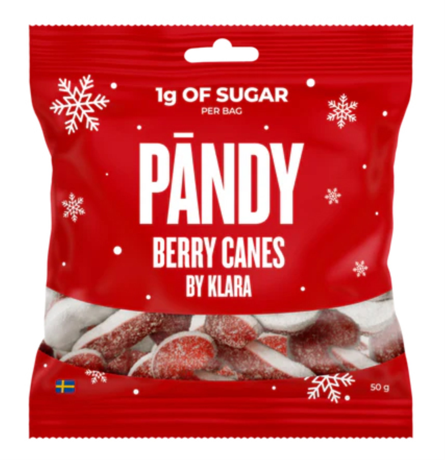 Pändy Candy Berry Canes by Klara er slik i julede polkastænger med kun 1 gram sukker per pose. Søde jordbær og blød vanilje giver en vidunderlig smagskombination, og geléen i kombination med skummet giver en skøn tekstur og bid.