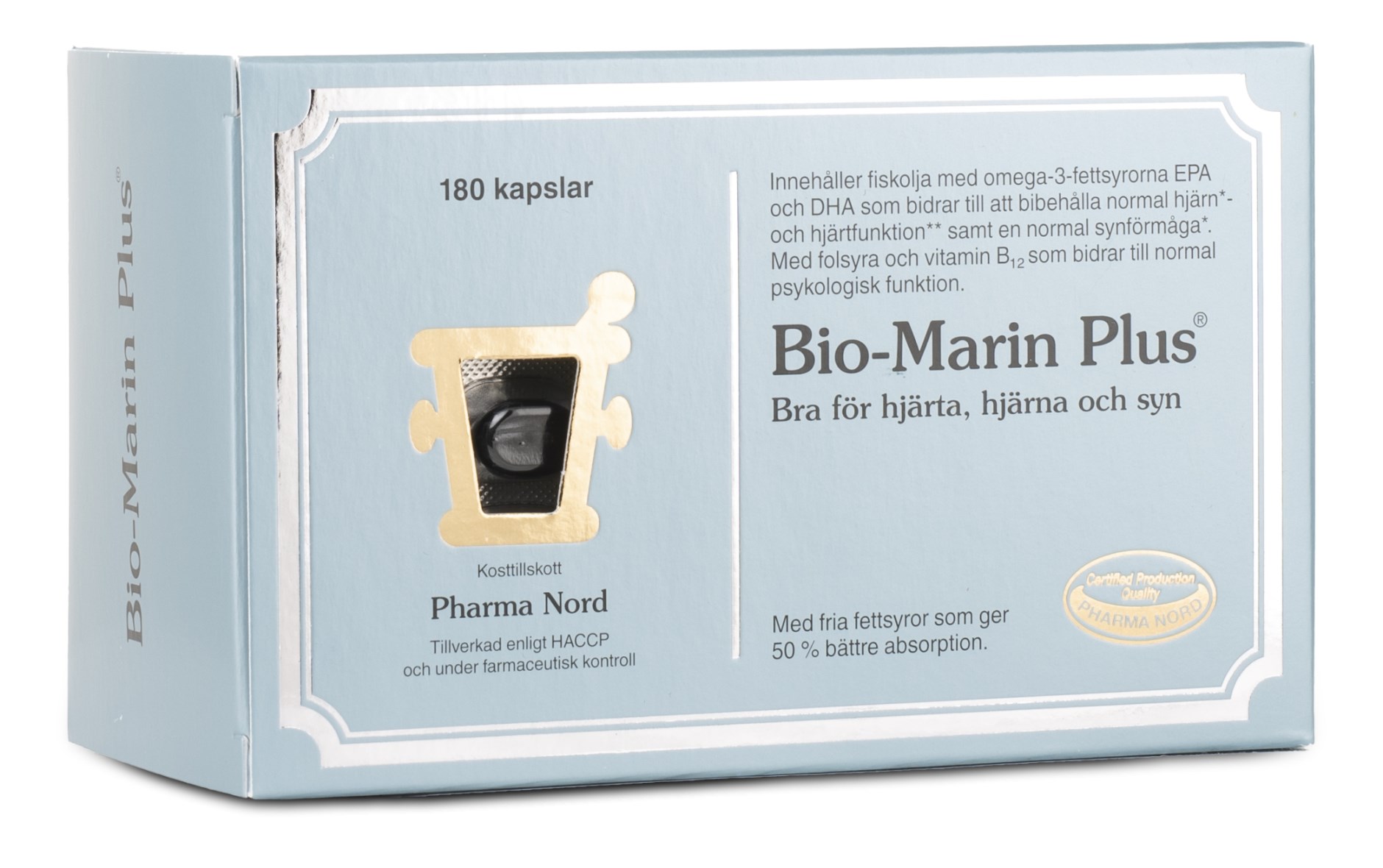 Pharma Nord Bio-Marin Plus består af frie fedtsyrer, som giver et hurtigere og bedre optag. Denne kombination af folsyre og B12-vitamin bidrager desuden til omsætningen af stoffet homocystein. Fiskeolien, som udvindes af dybhavsfisk, er nøje kontrolleret for at sikre, at den er fri for forureninger.