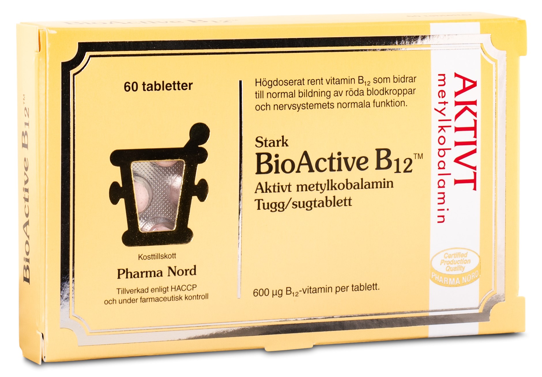 Pharma Nord BioActive B12 er et vitamintilskud af methylcobalamin, som er vitamin B12 i sin aktive form. Suge- og tyggetabletterne indeholder 600 mikrogram B12 per tablet og er smagssat med frisk pebermynte. Vitamin B12 er et vigtigt vitamin, der blandt andet bidrager til kroppens normale dannelse af røde blodlegemer og er også en væsentlig bestanddel for et normalt fungerende nervesystem. Pharma Nord BioActive B12 er et vegansk tilskud og kan hjælpe med at opretholde B12-niveauerne hos vegetarer og veganere, da B12 primært findes i kød- og mejeriprodukter.