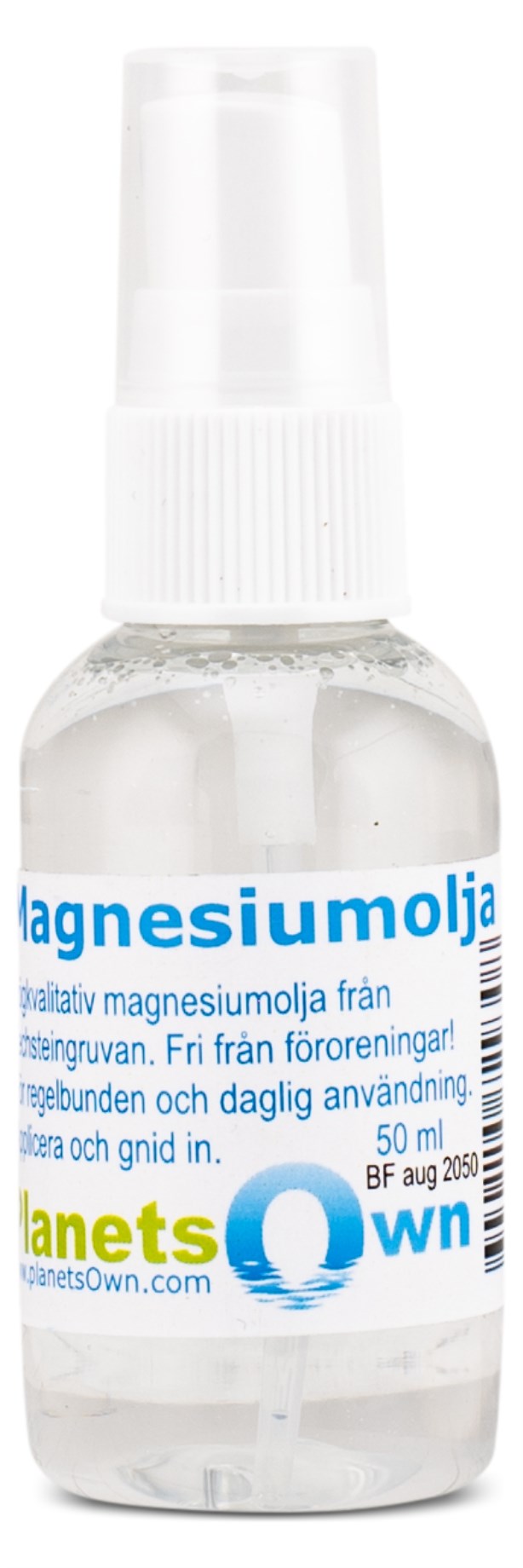 PlanetsOwn Magnesiumolie indeholder magnesiumchlorid i den reneste kvalitet, udvundet fra Zechstein-minen. Magnesiumolien fås i en større variant og en mindre, som er i en praktisk sprayflaske, perfekt til genopfyldning! Magnesiumolien sprayes nemt direkte på kroppen eller påføres med håndfladen for at smøre arme og ben.