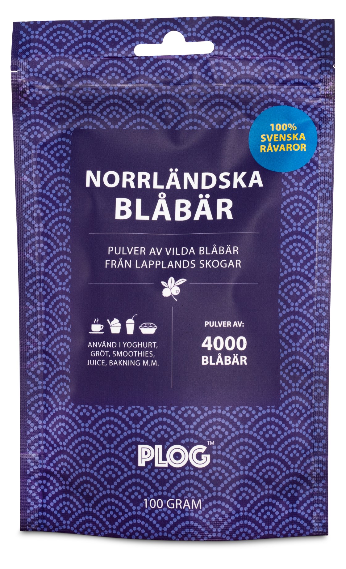 PLOG Nordlandske Blåbær er et næringsrigt pulver af blåbær. Blåbærrene har vokset vildt i de laplandske skove og er ubehandlede og nænsomt tørrede. Bærrene er tørret hele ved under 42 grader for at bevare alle næringsstoffer. Blåbær er rige på C-vitamin, fibre og antioxidanten anthocyanin. Af den væske, der bliver tilbage fra bærrene, laves blåbærdrik. Det næringsrige pulver er perfekt til at bruge i juice, yoghurt, smoothie eller i bagning.